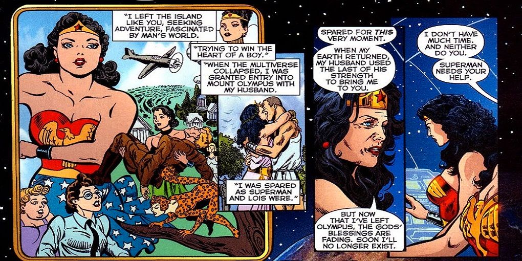 La línea argumental de Diana se pierde un poco en Crisis Infinita. Superman es la estrella, Batman es el tipo que tiene que arreglar el gigantesco error que cometió, y Wonder Woman es la persona injustamente juzgada por matar para protegerse. Ella pasa gran parte de la historia siendo aún peor en sí misma que todos los demás, y no es hasta que su yo alterno de la Tierra aparece que finalmente entra en razón. Es un momento épico, ya que la Tierra Dos Wonder Woman había recibido la misma protección que Superman y los demás, sólo que de una manera diferente. Ella usa lo último de su energía para ayudar a Diana a recuperar la cabeza.