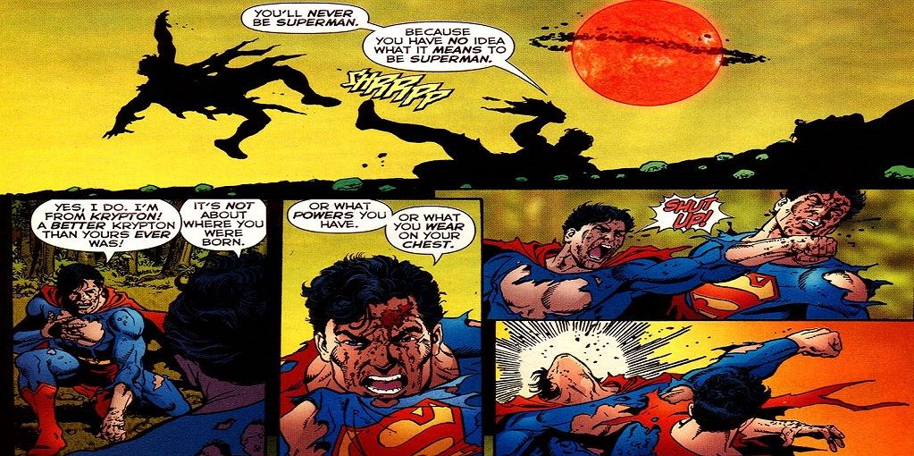 Todo se reduce a una última pelea de arrastre entre Tierra Dos Superman y Superman contra Superboy Prime. Superboy Prime tiene niveles de fuerza anteriores a la crisis, por lo que es más poderoso que cualquiera de ellos, e incluso en su Tierra Dos, Superman nunca llegó a igualar a sus homólogos de Tierra Uno o Tierra Primera. Hay que hacer un viaje a través de un sol rojo antes de que Superman tenga una oportunidad. Incluso después de vencer a Tierra Dos Superman, su mejor amigo, Superboy Prime, sigue convencido de que es el "héroe" de la historia. Pero Superman le recuerda que no se trata de venir de un mundo "mejor", sino de la "acción" necesaria para hacer de cualquier mundo un lugar mejor.