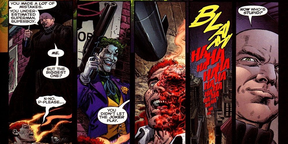 El Joker no tiene mucha importancia en este libro, y eso es porque no hay espacio para él. Pero también porque Alex Luthor pensó que El Joker era demasiado problemático para seguirle el ritmo, y eso vuelve para morderlo. Aunque Alex escapa, es atrapado tanto por Lex como por El Joker, y El Joker recompensa las acciones de Alex con una flor de ácido... y le dispara. Esta es probablemente la razón por la que cada grupo de supervillanos parece incluir un comodín.