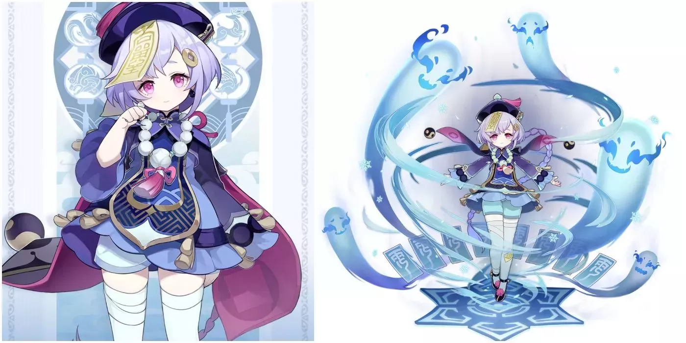 Qiqi trabaja en la Farmacia Babu del Puerto de Liyue bajo el cuidado de Baizhu después de haber sido resucitada como zombi. Su espada tiene ataques estándar, pero sus ataques elementales son los que más destacan. Arte de Adeptus: Heraldo de la Escarcha es un ataque en el que Qiqi utiliza el Talismán de la Vena de Hielo para hacer surgir el Heraldo de la Escarcha, que inflige daño.
