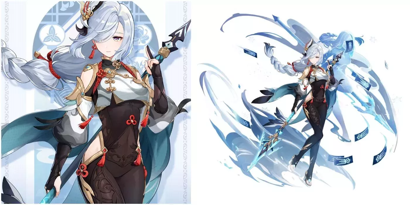Shenhe es una discípula del Retenedor de las Nubes tras sufrir un suceso traumático en su infancia. Blande un arma de asta que le permite realizar hasta cinco ataques consecutivos. Su ataque Invocación de espíritus en primavera otorga a todos los miembros del grupo cercanos el efecto Pluma helada, que aumenta el daño de los ataques normales, cargados y en picado, así como de las ráfagas y habilidades elementales.