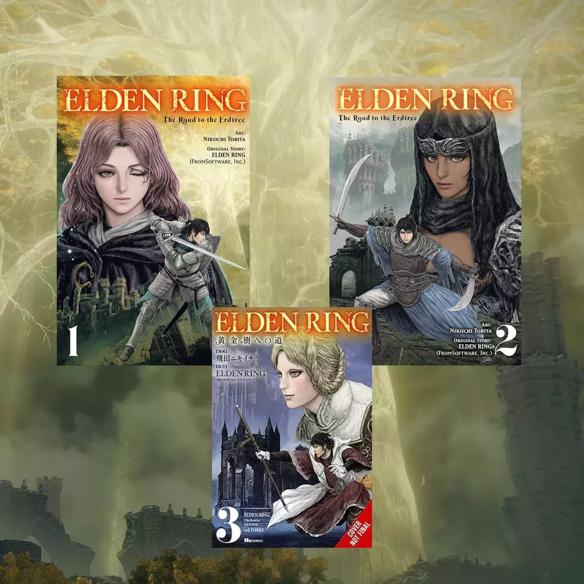 El manga oficial es un conjunto de tres volúmenes ilustrados por Nikiichi Tobita que sigue a un Tarnished llamado Aseo en su viaje para convertirse en el próximo Elden Lord,
