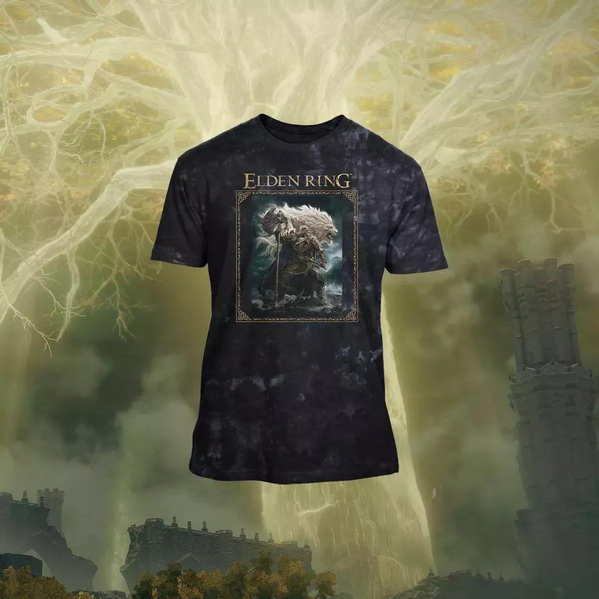 No es exactamente un león espectral, pero servirá. Esta camiseta lavada con cristal lleva la imagen de Godfrey, el primer Señor de los Elden, y de la Bestia Regente Serosh junto con el logotipo.