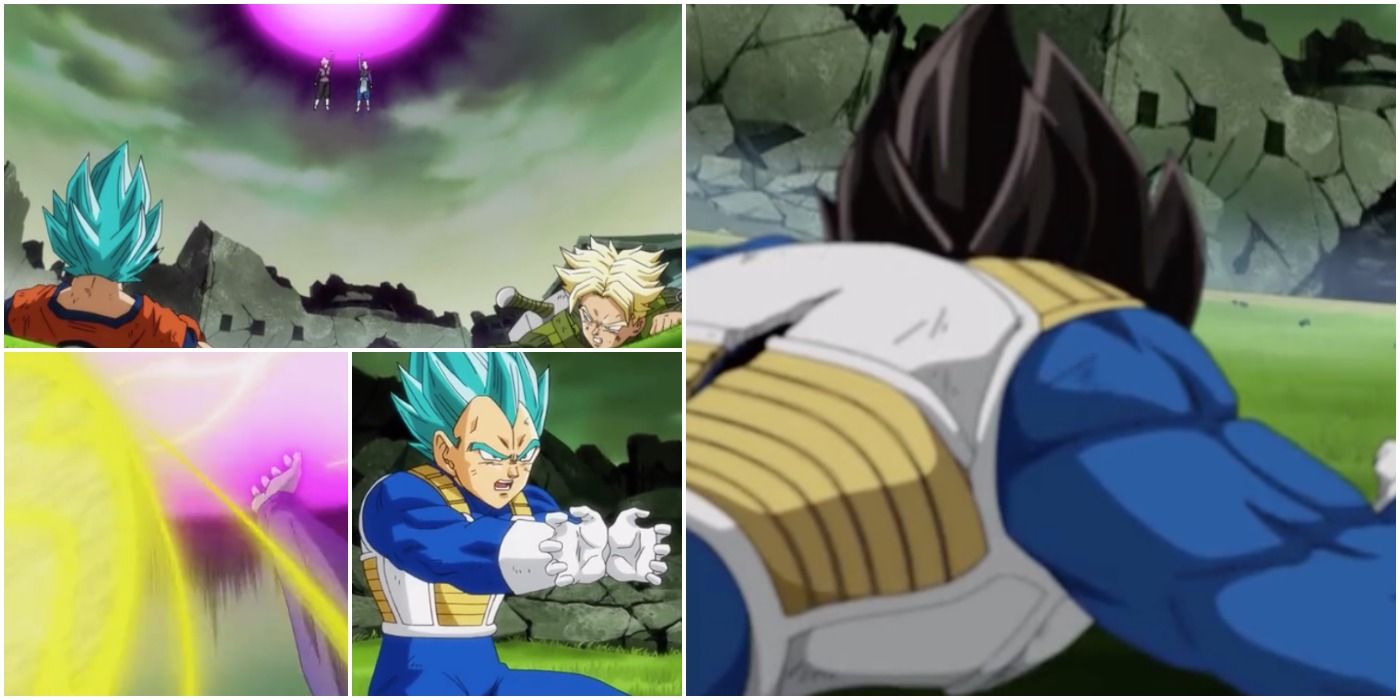 Durante el primer enfrentamiento de Vegeta con Goku Black, fue apuñalado poco después de que la batalla comenzara. Esto dejó a Goku y a Future Trunks sin la mano extra que les hubiera permitido acabar potencialmente con el Arco Negro de Goku justo ahí. Justo cuando Goku Black y Zamasu se preparaban para acabar con Goku y Trunks, Vegeta, en su tradicional forma heroica, logró desviar su ataque combinado de ki en el último segundo.