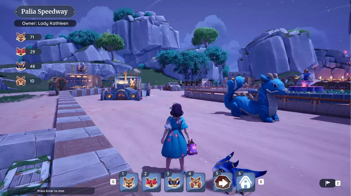 Para los que prefieren la velocidad, la Palia Speedway de Lady Kathleen fue un punto culminante de mi recorrido. El jugador ha utilizado peluches gigantes para poner dragones en la pista de carreras -lo cual tiene sentido, me parece que parecen bastante veloces- y luego se ha esforzado en construir coches y carros personalizados con piezas de piedra y construcciones PalTech. Aunque la carrera queda congelada para siempre en el tiempo, me encanta el esfuerzo que se ha hecho para crear un escenario tan enorme.