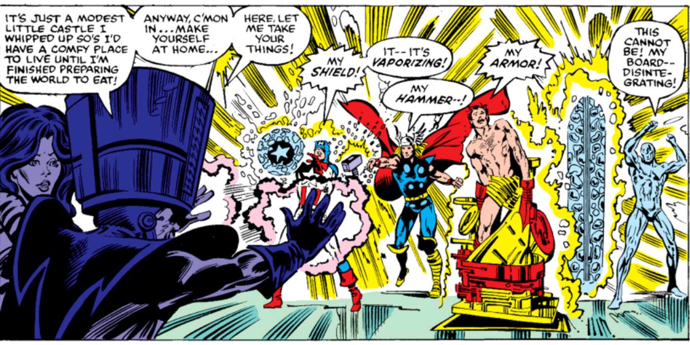 Doom se las arregla para robar el poder cósmico del Beyonder y con una enorme explosión de energía vuela a los héroes reunidos tratando de detenerlo. En los escombros, vemos los restos del escudo roto del Capitán América. Las cosas mejoraron una vez que el Beyonder recuperó su poder.