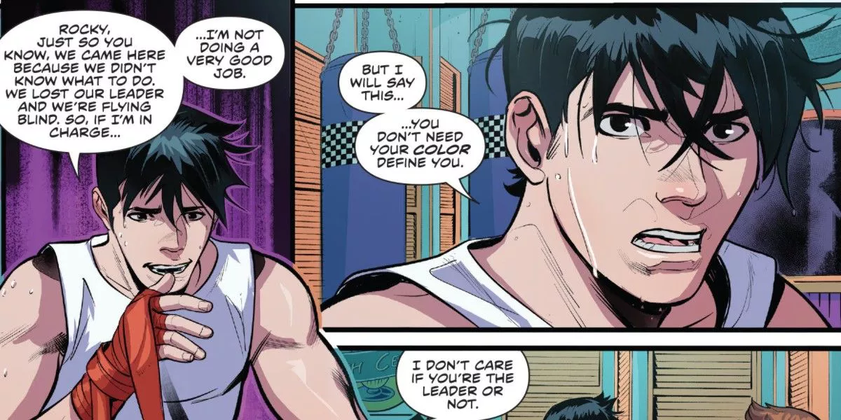 Esto lleva a un momento importante y vulnerable de un Red Ranger a otro. Mientras que Rocky está decepcionado de sí mismo por no liderar, Jason le dice que ser un líder no es tan bueno como parece. Jason puede liderar a los Omega Rangers, pero le recuerda a Rocky que no sabe lo que hace la mayor parte del tiempo. Se siente como si estuviera loco por ser un Omega Ranger y muchos de los líderes están "volando a ciegas y averiguando las cosas sobre la marcha". Como Jason le dice a Rocky, el color de su uniforme de Ranger no lo define.