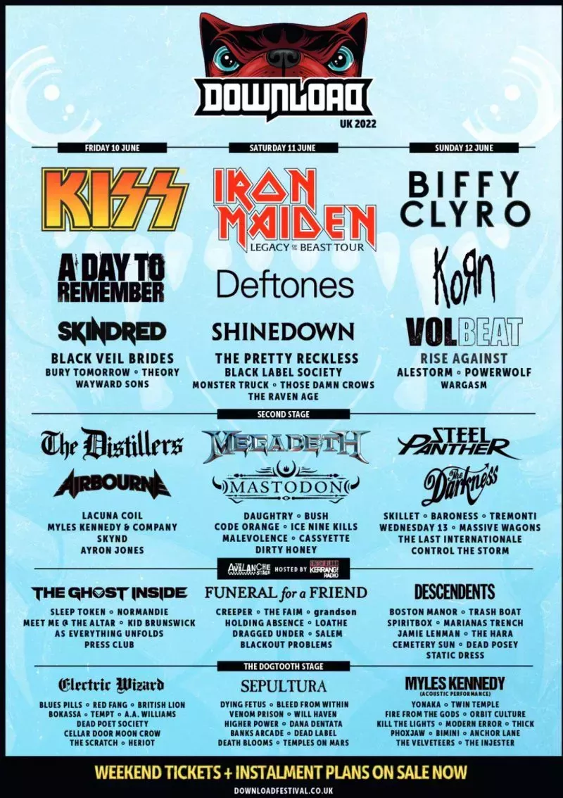 Download 2022 tendrá lugar del 10 al 12 de junio en Donington Park, con actuaciones de artistas como KISS, Iron Maiden, Biffy Clyro, A Day To Remember, Mastodon, Creeper, Shinedown, Black Veil Brides, Code Orange, Ice Nine Kills, Funeral For A Friend, Megadeth, Descendents, The Pretty Reckless, Rise Against, Skindred y Yonaka.