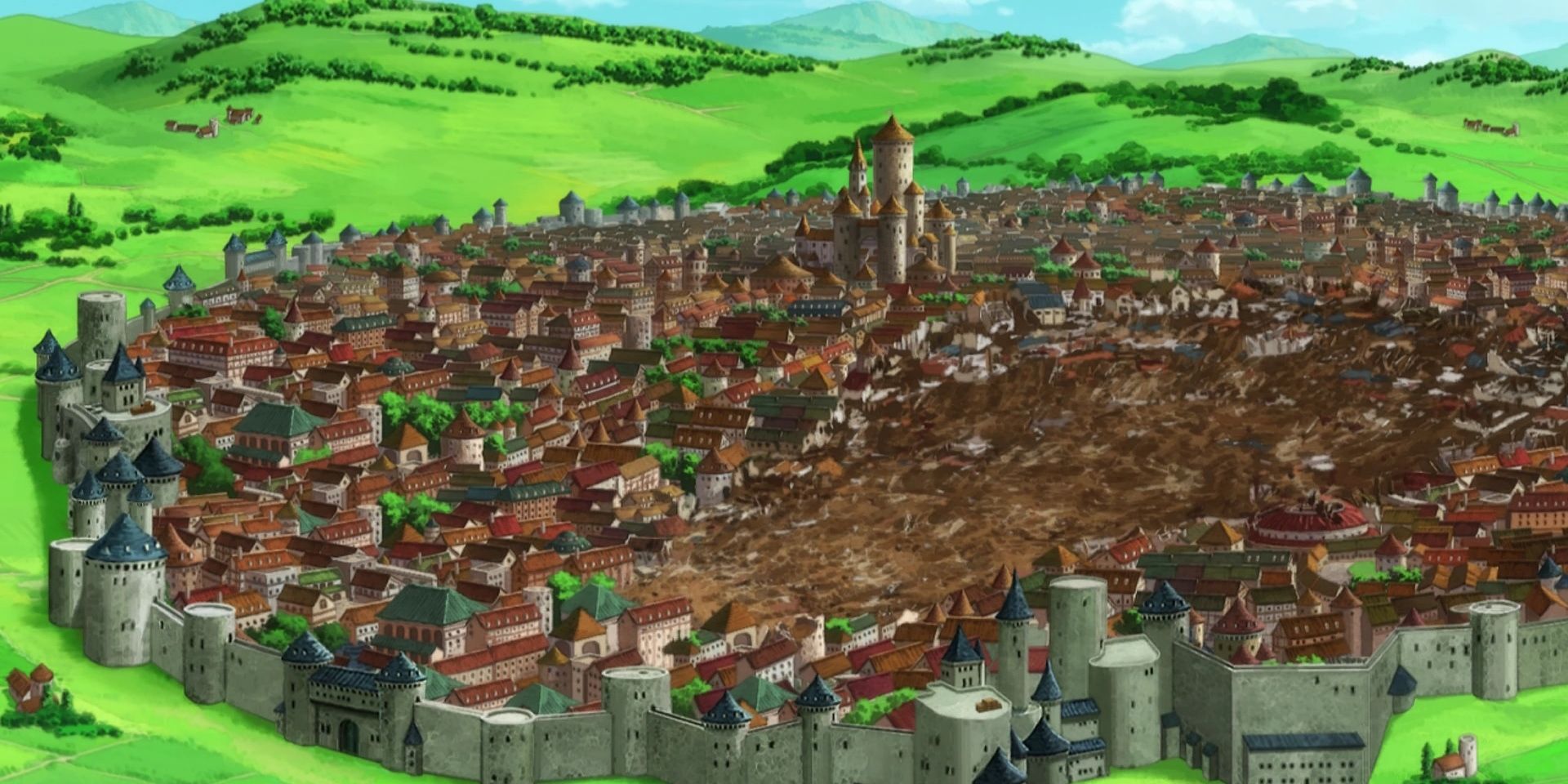 Se dice que losSiete Pecados Capitales tienen lugar en una época antigua, antes de que los humanos y los seres mágicos estuvieran separados en el mundo. La llegada de Arturo y el destino de Camelot son una misma cosa. Es una ciudad prometedora, pero cae en la ruina tras su muerte.