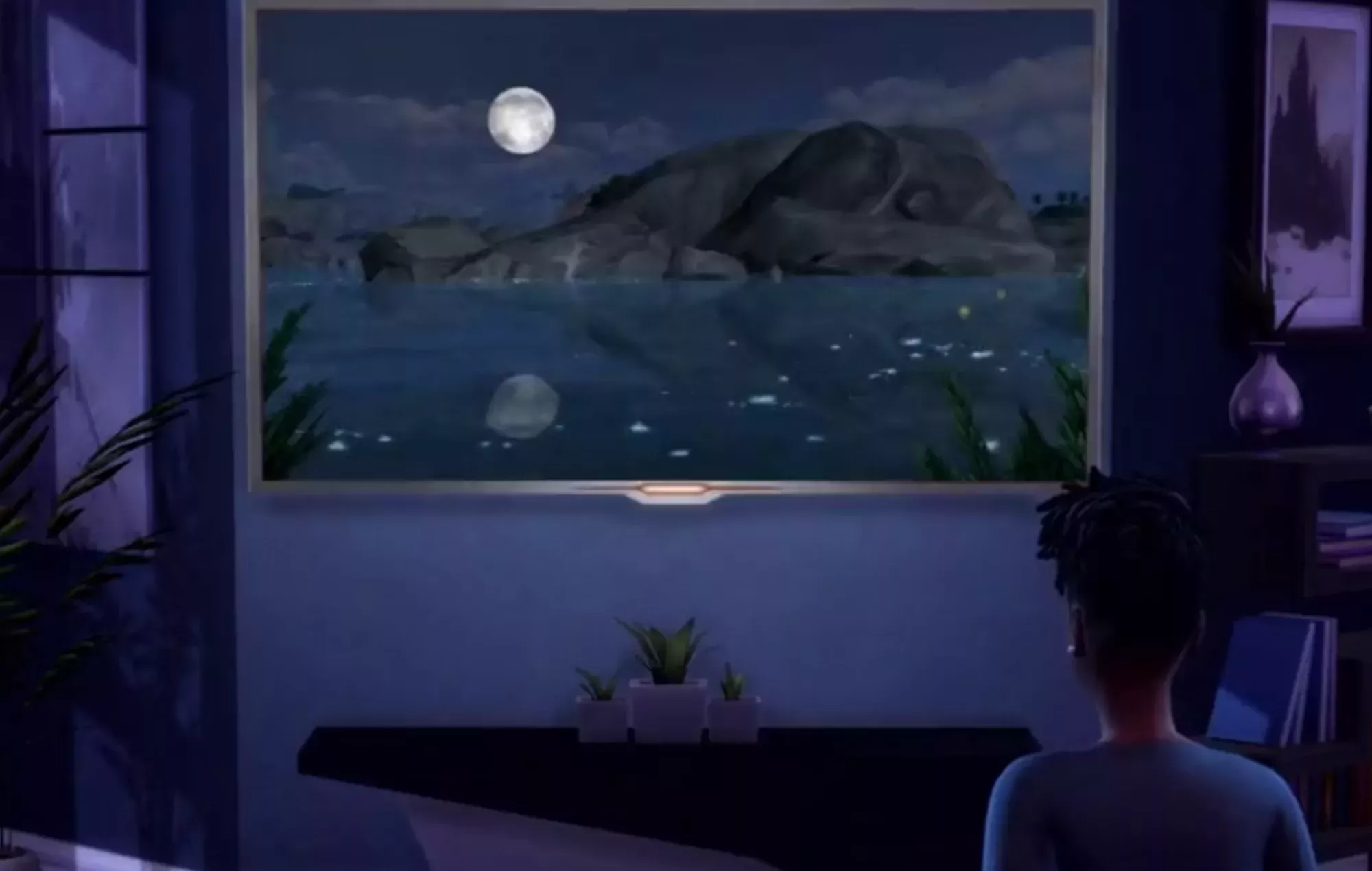 El vÃdeo muestra a un Sim en el juego pasando por varios canales de televisión, con uno en particular que muestra un paisaje nocturno con luna llena. Fuera de la pantalla, un lobo aúlla antes de que el Sim cambie de canal.