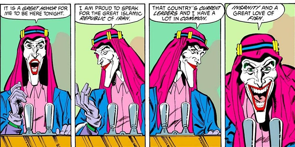Como el loco más loco del universo de DC, el Joker es la persona mejor o peor preparada para ocupar un puesto importante en el gobierno. Esta hipótesis se complica aún más cuando se tiene en cuenta el hecho de que en realidad trabajó como embajador de la ONU para la nación de Irán. (Más tarde, esto le sería devuelto por haber sido el embajador del país ficticio de Qurac).