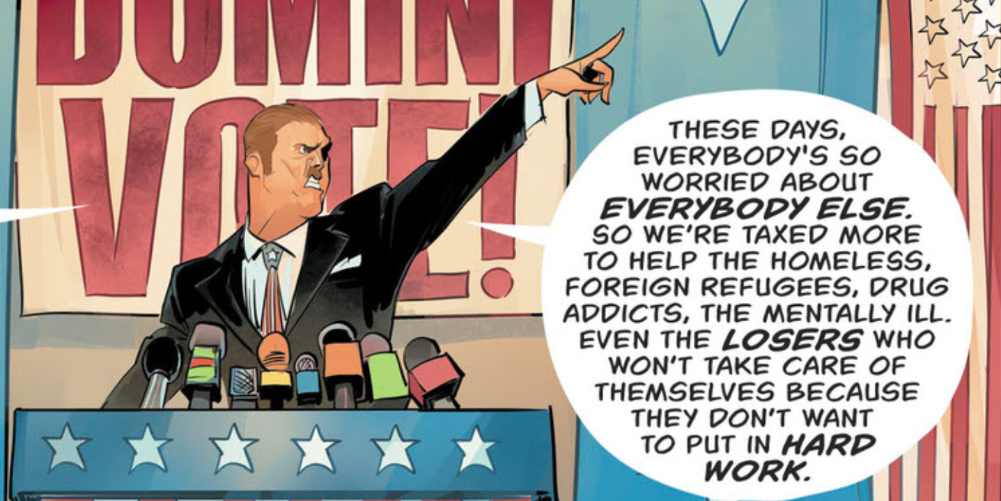 Creado por el escritor Benjamin Percy durante su carrera en Green Arrow, Nate Domini es un hombre de negocios de Seattle que se postuló para alcalde. Un hombre que hizo campaña sobre la importancia de la ley y el orden, la protección de las empresas y la ayuda a la comunidad, no se preocupó ni por la ley ni por las comunidades, utilizando su negocio y su riqueza para oprimir a la mayor cantidad de gente posible. Invocó la retórica xenófoba en sus mítines de campaña y utilizó a la policía militarizada como escuadrón personal de matones.