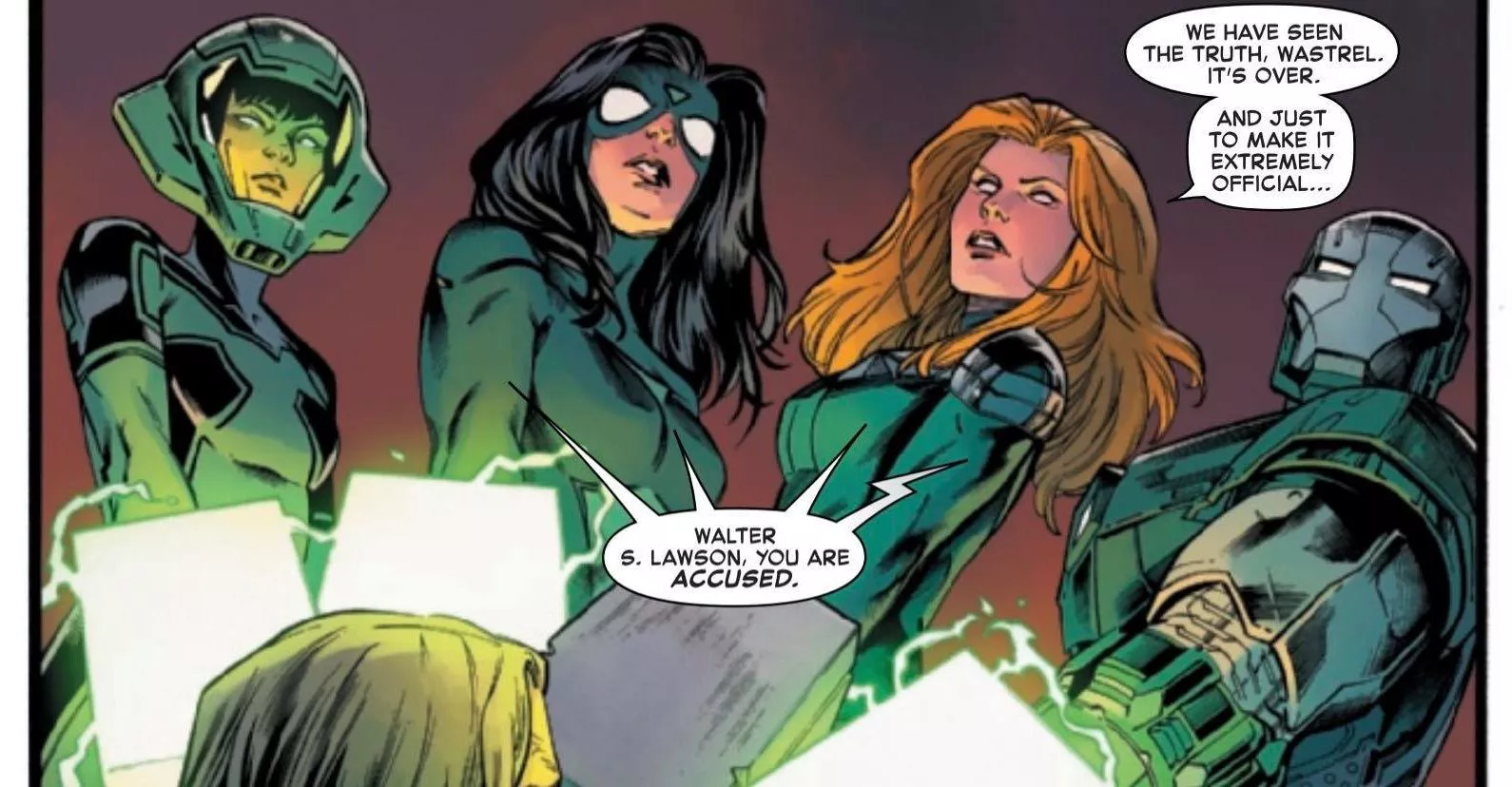 El Capitán Marvel #20 puede ser un libro de enlace de Empyre, pero tiene muy poco que ver con la invasión real de Cotati que tiene lugar en la serie de eventos principales. En su lugar, durante la mayor parte del número, Carol lleva a su nueva tripulación de Vengadores al espacio, donde espera limpiar el nombre de su hermana encontrando al verdadero culpable de la destrucción de la ciudad kree/skrull de K'in-al. Por suerte, Carol ya tiene otro sospechoso en mente en la forma de Walter Lawson, alias Wastrel.