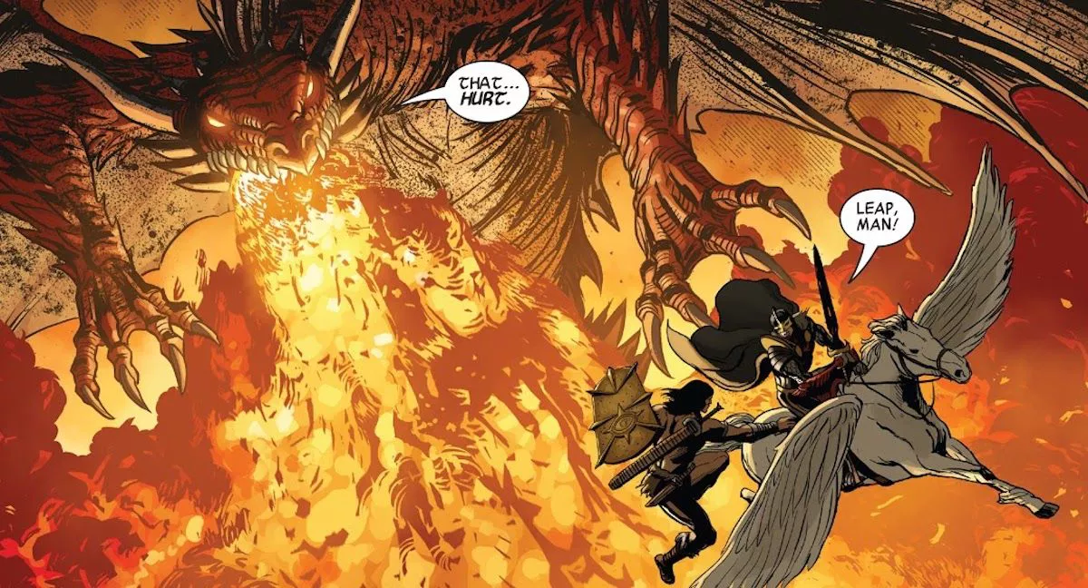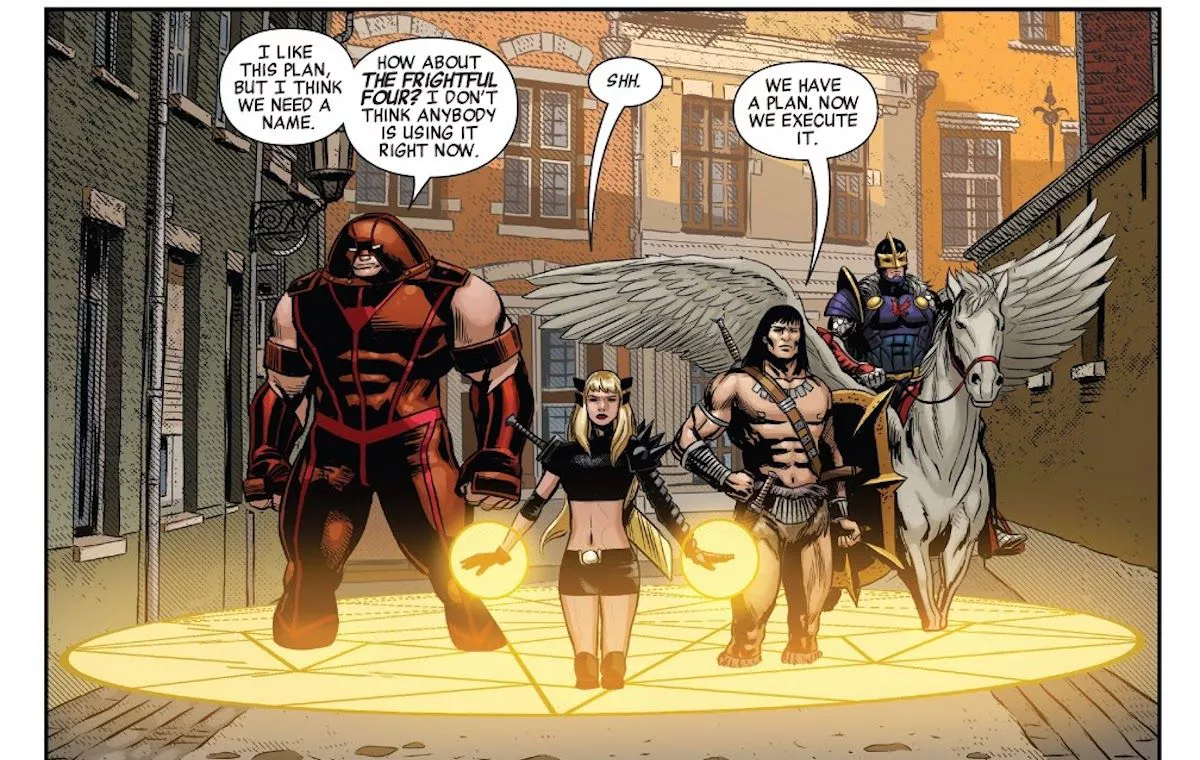 Pero este "Terrible Cuatro" que Juggernaut bautiza es el más salvaje de todos. Los hechizos y poderes de teletransportación de Magik, sin mencionar su Espada del Alma, la convierten en la líder perfecta, con Conan respaldándola con su bruto Cimmeriano. Cuando empiezan a cortar a Sadurang, la Hoja de Ébano del Caballero Negro y su caballo alado, Galadriel, también lo hacen bastante formidable, con la guinda del pastel que viene cuando Magik lanza Juggernaut desde lo alto del aire como un misil.