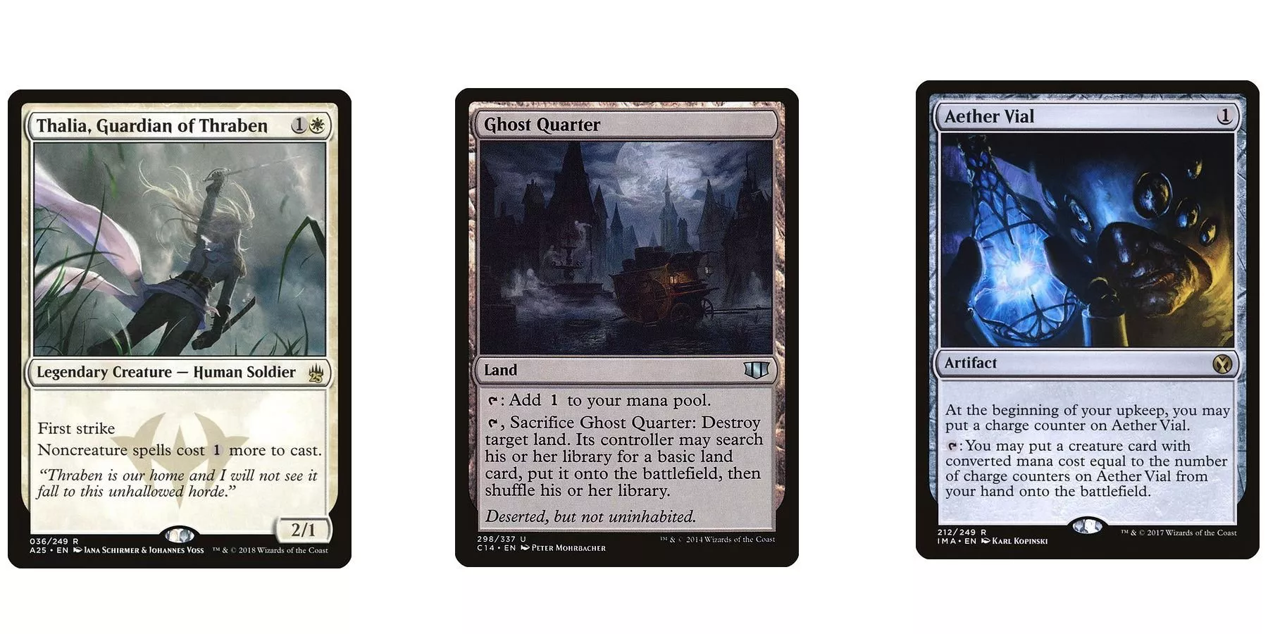Los hechizos de esta cubierta que no son de criaturas son limitados pero eficientes. Tiene un juego de "Camino al exilio", que es útil para deshacerse de cualquier criatura problemática por sólo W. Además, Aether Vial es un artefacto barato que puede tener contadores de carga colocados en él, y puede golpear para poner una criatura en el campo de batalla sin pagar ningún maná. Esto hará que 1) las criaturas sean libres, 2) poner criaturas en el campo de batalla a velocidad instantánea y 3) esquivar contra-hechizos. La trampa de hechizos o comando críptico del oponente estará indefenso.