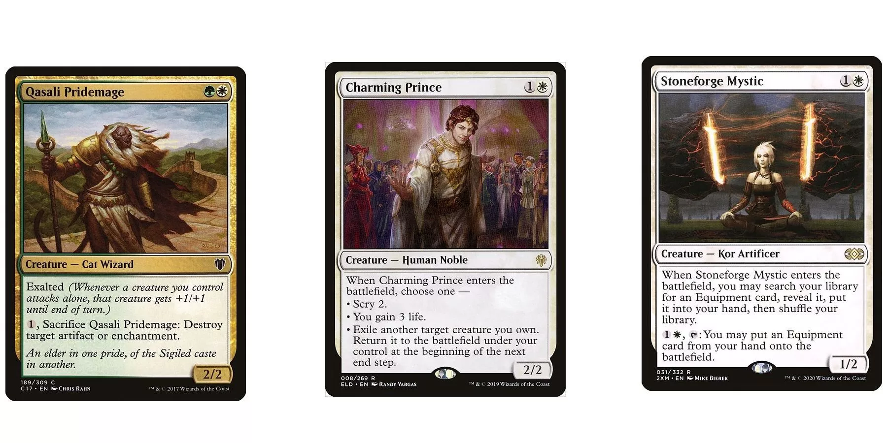 En esta cubierta se pueden colocar diversos efectos relacionados. En una meta pesada de cementerio, la baraja de Muerte e Impuestos puede incluir Dryad Militant, un híbrido verde/blanco de 2/1 que exilia todos los instantes y hechizos que se ponen en los cementerios. Charming Prince puede ayudar a ganar vida, a codificar o exiliar cartas amistosas, y Stoneforge Mystic funciona muy bien si esta baraja hace hincapié en los equipos poderosos (como la Espada de Fuego y la de Hielo). El Pridemage Qasali puede aparecer en las construcciones W/g, impulsando a los atacantes solitarios y sacrificándose para eliminar los artefactos y encantamientos enemigos.