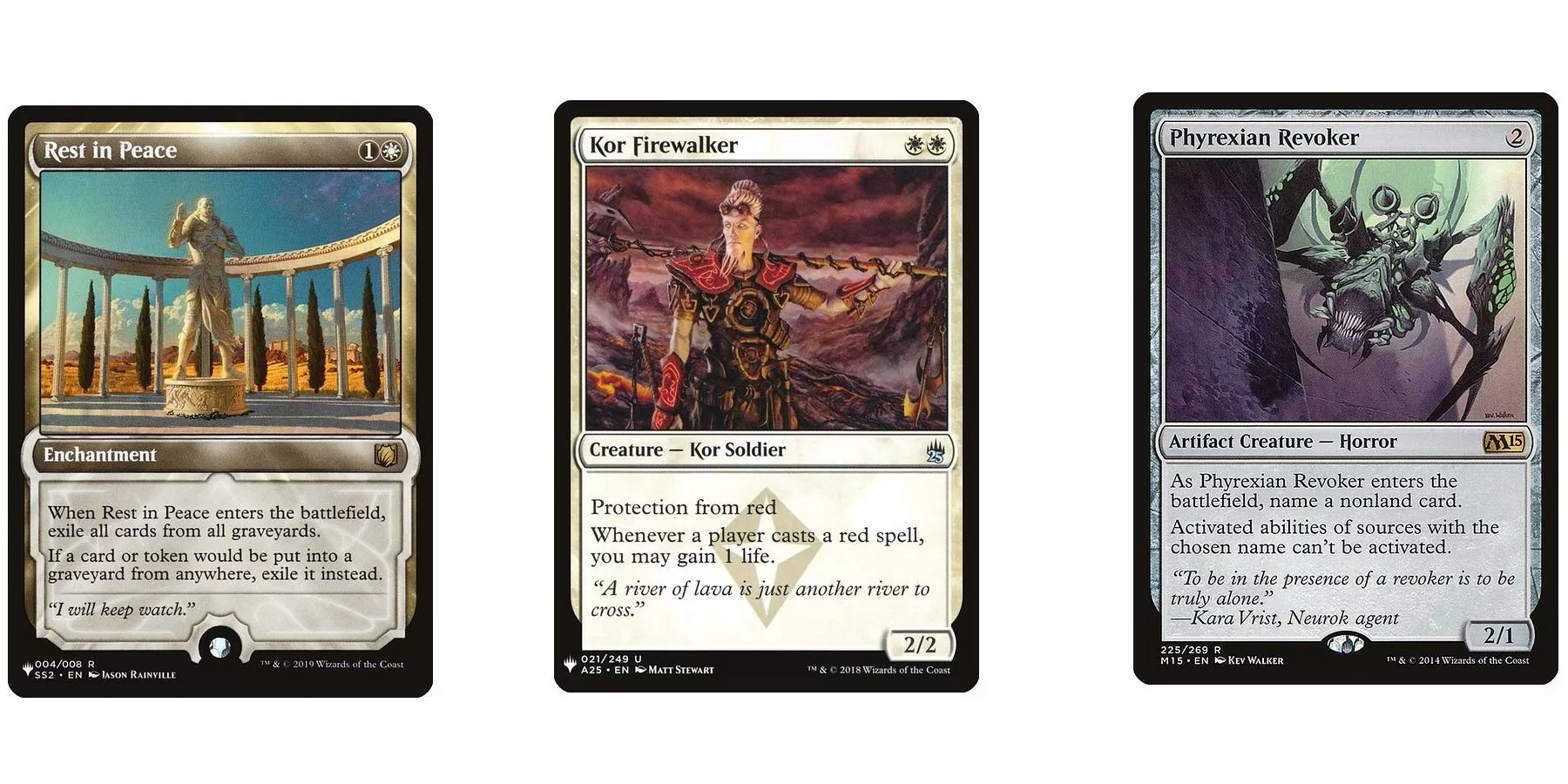Mientras tanto, contra Burn y otras cubiertas rojas, Kor Firewalker puede bloquear todo el día y ganar vida. Burrenton Forge-Tender también tiene protección contra el rojo y puede sacrificarse para anular todos los daños de una fuente roja (como el Rayo). Descansa en paz es una opción contra las cubiertas de los cementerios como Dredge y Living End, y Leyline of Sanctity es genial contra Burn y Ad Nauseam. También, considera a Mirran Crusader contra las cubiertas Jund, Abzan y Dredge (protección contra el verde y el negro).