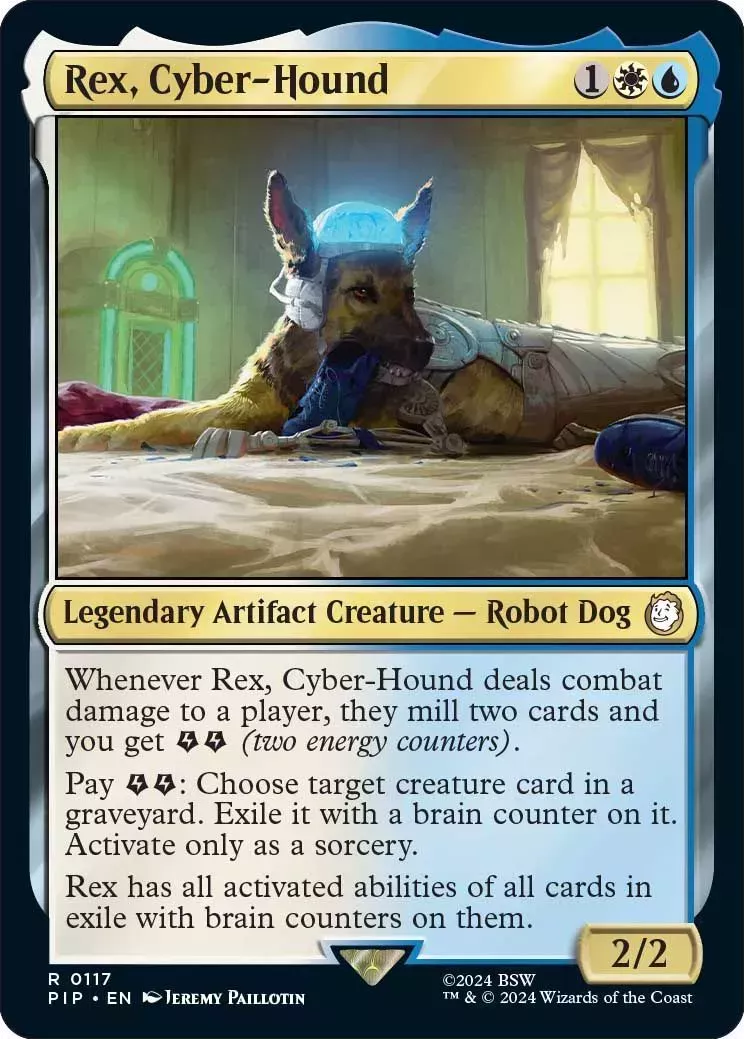 Rex Cyber-Hound no es sólo un compañero favorito de los fans de la serie Fallout, es una de las pocas cartas que recuperan la mecánica de EnergÃa introducida en Magic: The Gathering en Kaladesh. A pesar de que la EnergÃa es una mecánica parásita, ya que sólo juega sobre sà misma en lo que respecta al espacio de diseño en el que habita, fue alabada por los jugadores, y su regreso es una buena señal de lo que Magic: The Gathering Universes Beyond - Fallout tiene preparado.