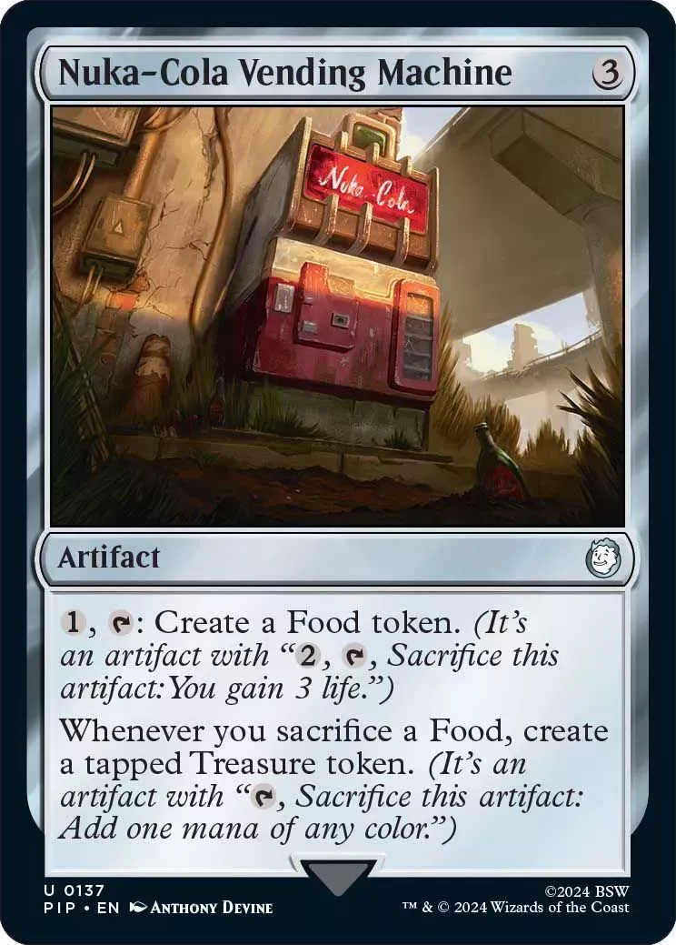Dicho esto, la próxima Máquina expendedora de Nuka-Cola se convertirá en una estrella desde su lanzamiento, tanto por su sabor como por su jugabilidad. Tres manás genéricos por un artefacto que genera fichas de comida baratas y convierte la comida que sacrifica su controlador en fichas de tesoro es un coste bajo para un efecto asÃ. Puede que la creación y activación de las fichas de Comida producidas por la Máquina expendedora de Nuka-Cola tenga un coste inherente, pero el hecho de que literalmente se paguen solas, aunque sólo sea en parte, compensa cualquier argumento en contra.