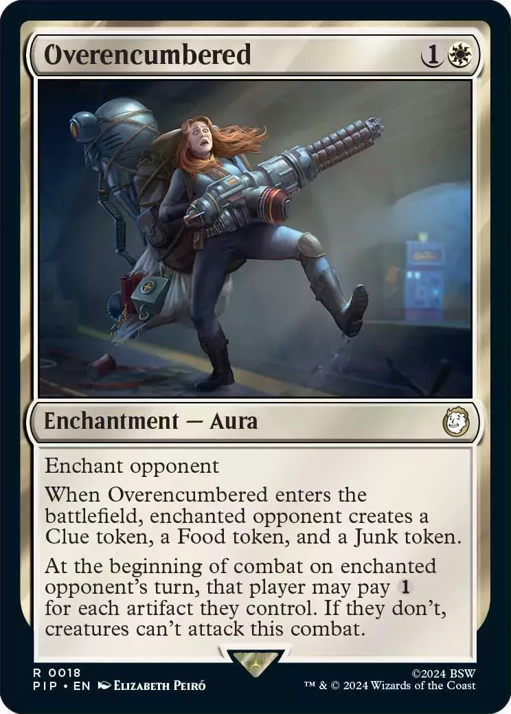 Overencumbered no bloquea exactamente el paso de combate de un oponente, pero sà se lo prohÃbe en cierta medida al obligarle a pagar maná por cada artefacto que controle si quiere atacar con sus propias criaturas. Dicho esto, las tres fichas de artefacto que produce Overencumbered para el oponente sobre el que cae no son tan prohibitivas por sà solas, pero la abrumadora presencia de artefactos en el formato Commander significa que probablemente no serán las únicas que el oponente se vea obligado a pagar si quiere hacer algún avance significativo en su turno.