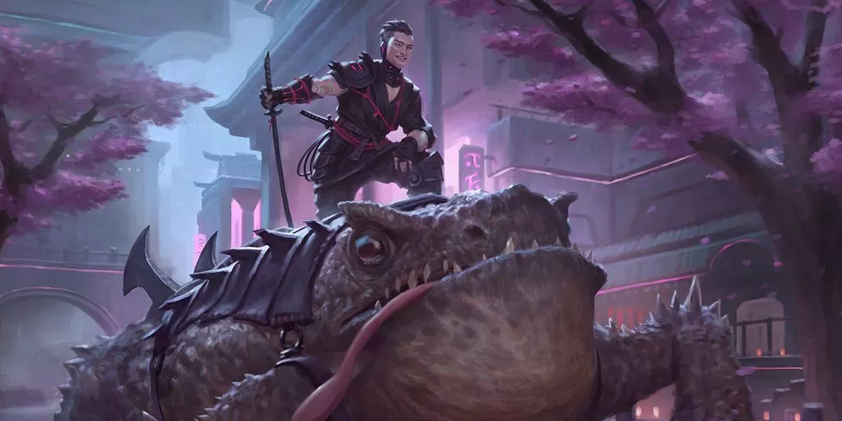Introducido en Kamigawa: Neon Dynasties, Tatsunari era un ladrón callejero de poca monta que se obsesionó con la magia de los kami tras intentar robar a un monje. Ningún espíritu quería trabajar con él, así que levantó un sapo de un canal para que se convirtiera en su enorme montura.
