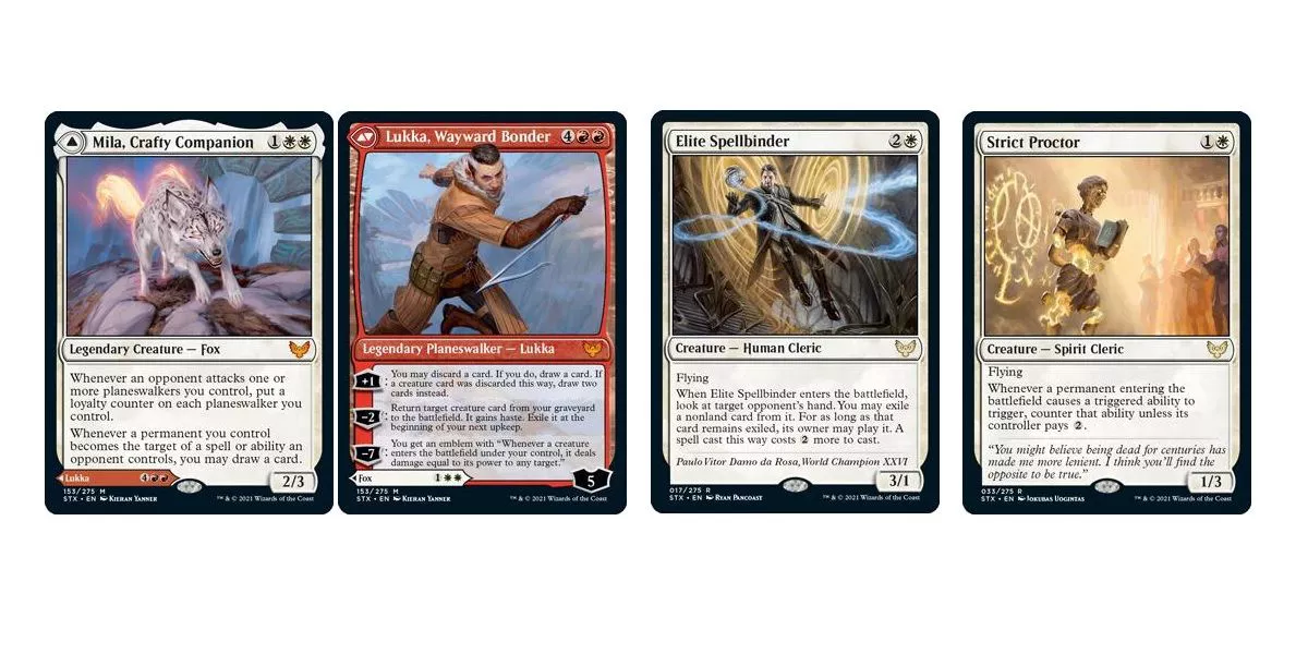 Por su parte, Elite Spellbinder fue diseñado por Vitor Damo de Rosa, actuando como una especie de Vendilion Clique blanco, un elemento básico en muchos mazos de control modernos. Este complicado clérigo humano vale alrededor de 3 $. A continuación está Strict Proctor, que tiene el clásico efecto de maná blanco de gravar los efectos del oponente, como la baraja Modern Death & Taxes. MTG Goldfish lo tiene a 1,50 dólares, y Clever Lumimancer, que debería ser efectivo en partidas de booster draft Limited, vale unos 1,70 dólares.