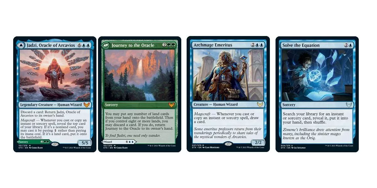 En cuanto a las cartas azules de Strixhaven, la primera es Jadzi, Oráculo de Arcavios, un Mago Humano 5/5 que también puede ser lanzado como Viaje al Oráculo. Esta impresionante bomba mítica tiene un precio de 4,60 dólares. El Archimago Emérito, cuyo activador de magia puede generar una generosa ventaja de cartas, es la segunda carta azul más valiosa, a unos 2 dólares. También está Solve the Equation, un efecto "tutor" en azul que puede buscar en la biblioteca cualquier instantáneo o conjuro, poner esa carta en la mano y luego barajar. Es como el hermano pequeño del Tutor místico, que vale al menos 20 dólares. Los efectos de tutor pueden ser decisivos cuando un jugador necesita una carta para ganar la partida o una pieza de combo.