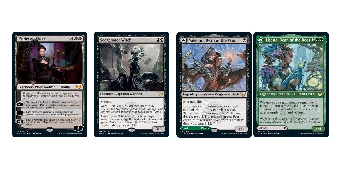 Entre las cartas mononegras de Strixhaven, el Profesor Onyx destaca claramente, ya que es el regreso de la planeswalker Liliana en toda su gloria nigromántica. Esta planeswalker no es sólo una cara conocida; también es increíblemente poderosa, incluyendo su uso de la magia. La carta vale actualmente algo menos de 16 $. La Bruja de Sedgemoor promete ser poderosa en Limitado, creando fichas de Plaga y protegiéndose con una instancia de guardia basada en la vida; vale 2,50 $ en el momento de escribir este artículo. Valentin, decano de la vena es una de las cinco cartas de decano de doble cara, que representa la escuela de Witherbloom, y actualmente vale alrededor de 1,30 $. Debería impulsar los mazos limitados de Witherbloom.