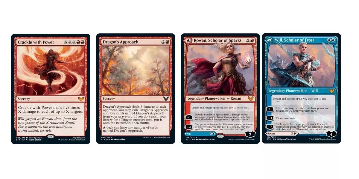 Algunas cartas rojas de Strixhaven son notables, como la carta exponencial Crackle With Power, que puede escalar rápidamente para infligir un daño masivo a unos pocos objetivos. Este hechizo rojo hambriento de maná vale unos 2,50 dólares. Sorprendentemente, una simple carta común vale casi lo mismo: Dragon's Approach, que actualmente vale 2,32 dólares según MTG Goldfish. Puede infligir tres daños a cada oponente, y luego exiliarse a sí mismo y a varias copias más para invocar a cualquiera de las poderosas criaturas Dragón que se encuentran en Strixhaven. Luego está el planeswalker rojo Rowan, Erudito de las Chispas, y su reverso, el azul Will, Erudito de la Escarcha. Podría decirse que el lado de Will es mejor, y esta carta vale 4,50 dólares.