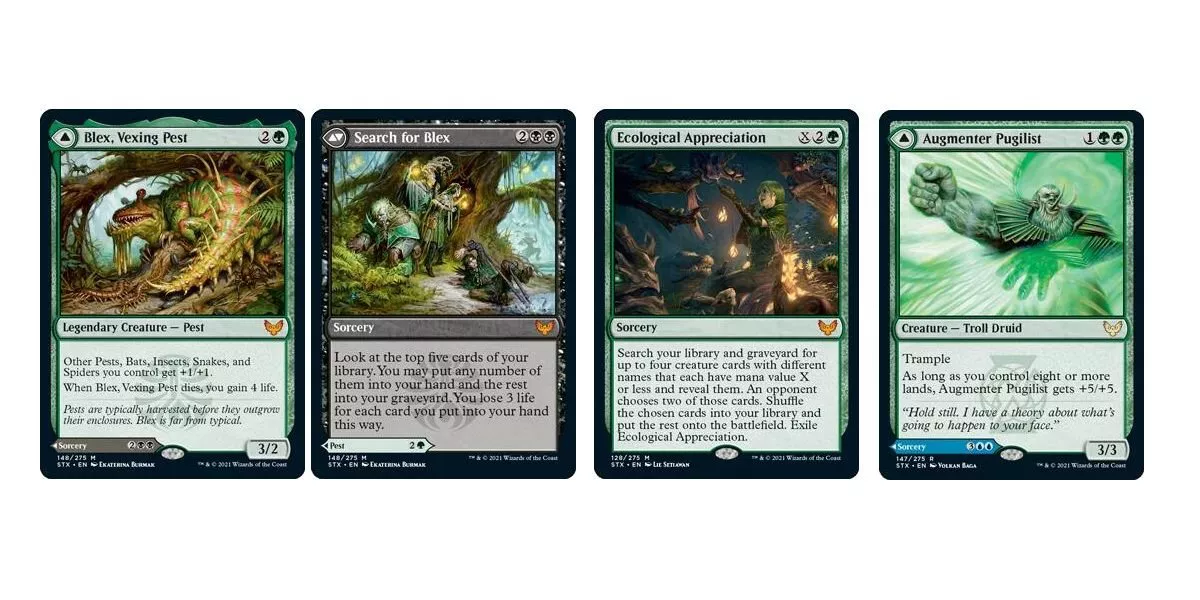 Las cartas mono-verdes de Strixhaven tienen un valor mínimo, pero algunas de ellas merecen ser discutidas. Blex, Plaga Viciosa es una carta de doble cara de la escuela Witherbloom. Es un 3/2 que potencia las Plagas y otras criaturas nocivas con un efecto de himno +1/+1. Si muere, el jugador gana cuatro vidas, alimentando en gran medida el tema de la "ganancia de vida" de esta escuela. Esta carta vale 2,80 dólares más o menos. Apreciación ecológica, un hechizo raro mítico que puede poner dos criaturas en el campo de batalla y barajar dos en la biblioteca, vale la misma cantidad. Aumentador pugilista sólo vale 0,60 dólares, pero los jugadores pueden disfrutar poniéndola en sus mazos de rampa de Quandrix y atacando con una barata amenaza de pisoteo 8/8 una vez que consigan suficientes cartas de tierra en el campo de batalla.