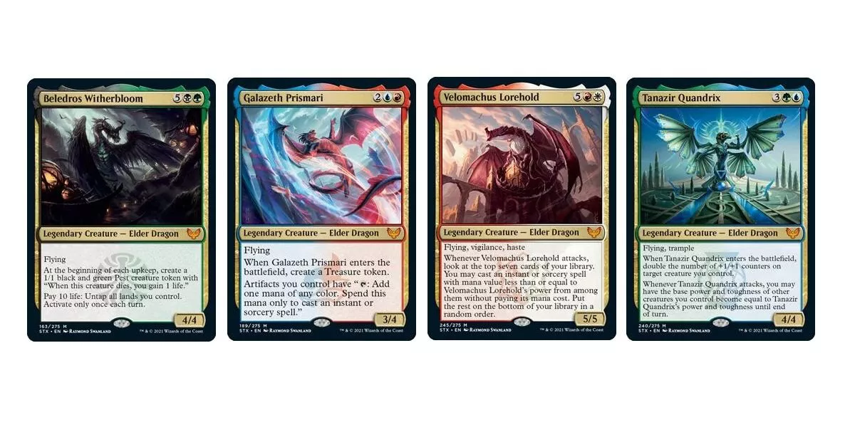 Como era de esperar, muchas de las cartas más valiosas y poderosas de la colección Strixhaven: School of Mages se encuentran entre las cartas multicolores, como los cinco dragones legendarios de sus respectivas escuelas. A la cabeza de la baraja está Beledros Witherbloom, un volador 4/4 que puede hacer Plagas rápidamente y pagar 10 vidas para enderezar todas las tierras y jugar hechizos adicionales (o pagar una tonelada de maná en un solo hechizo). Este elegante dragón de color Golgari vale casi 19 dólares, y los otros cuatro dragones valen entre 5 y 7 dólares cada uno, como era de esperar. Cualquiera de estos cinco puede servir para ganar la curva en las partidas de Limitado, y también podrían ser opciones atractivas para el formato de Comandante. Después de todo, es mucho más fácil pagar 10 vidas en Commander que en Limitado o Estándar.