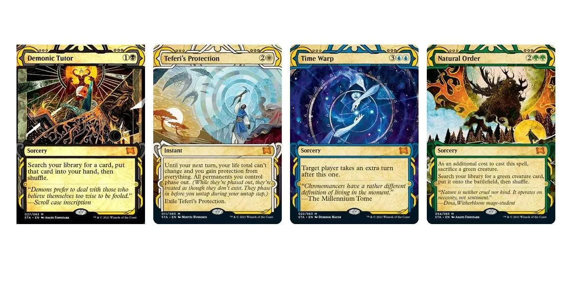 Según los números, la colección del Archivo Místico es donde el valor financiero de Strixhaven brilla de verdad, ya que se trata de reimpresiones de edición especial de cartas clásicas e imprescindibles de otros formatos. El famoso Tutor Demoníaco se lleva la palma con un impresionante precio de 45 dólares, y la Protección de Teferi, una carta blanca altamente defensiva, vale 30 dólares, demostrando que la antigua mecánica de fase puede ser útil y genial cuando se utiliza correctamente. Time Warp cuesta 12 dólares, y Natural Order vale unos 14 dólares, una gran forma de preparar una poderosa criatura verde.