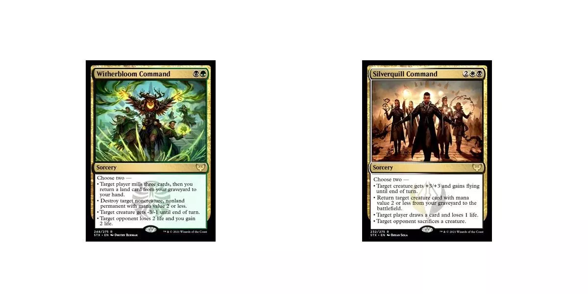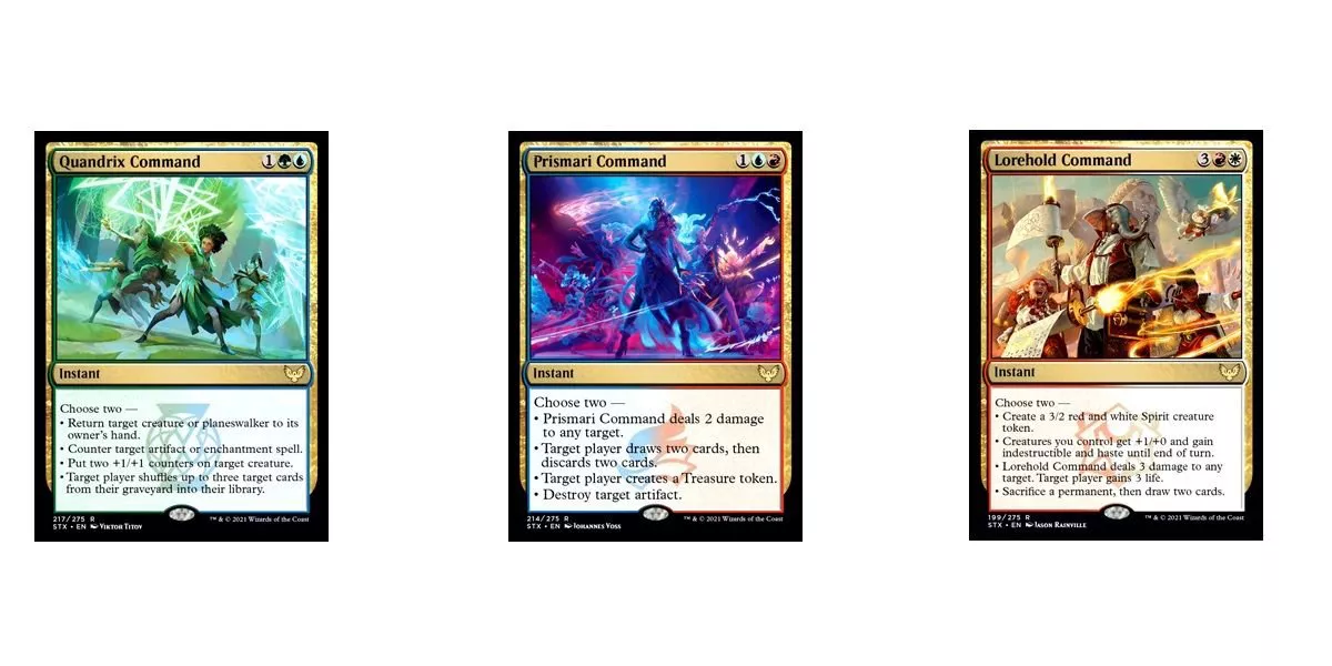 Muchas cartas de Magic vienen en ciclos de cinco, siendo los cinco Mandos de la colección Lorwyn y los cinco Encantos de la colección Fragmentos de Alaralos principales ejemplos, entre muchos otros. Mientras tanto, los primeros spoilers de Strixhaven han desvelado un ciclo muy interesante: cinco comandos de color enemigo. La colección Dragones de Tarkir contaba con cinco mandos de color aliado, como el poderoso Mando de Kolaghan, y estos cinco mandos se unen a sus nuevos primos de Strixhaven para formar un megaciclo de mandos de dos colores.
