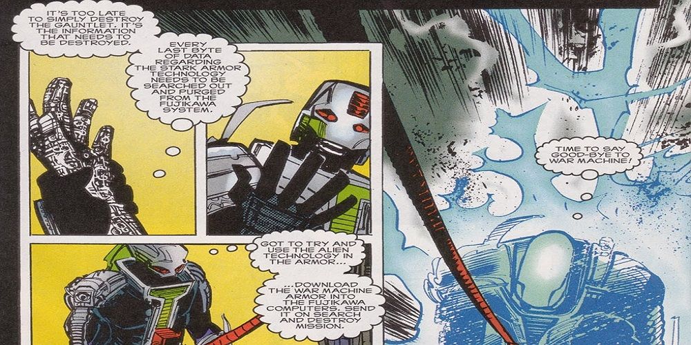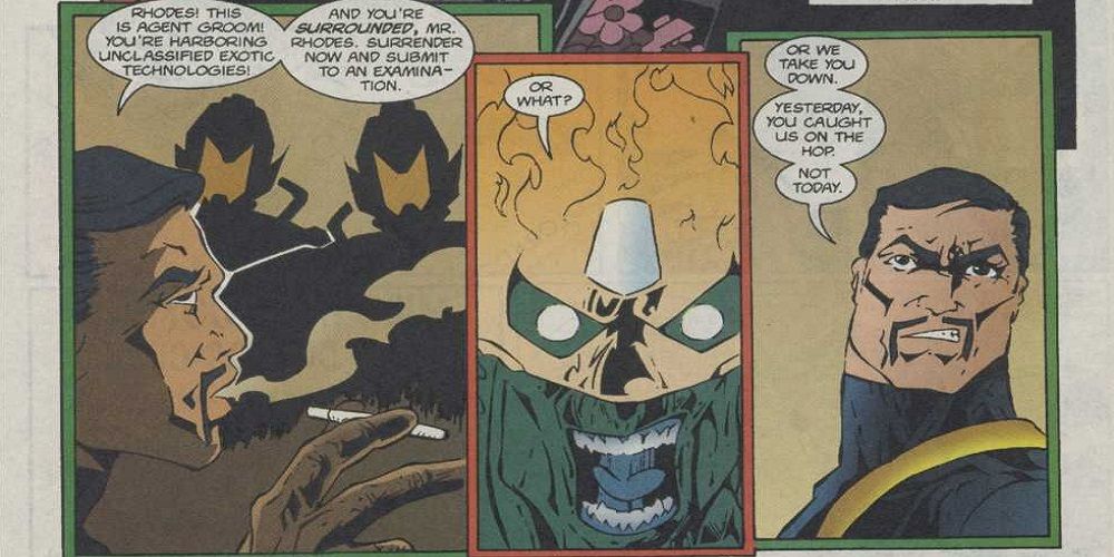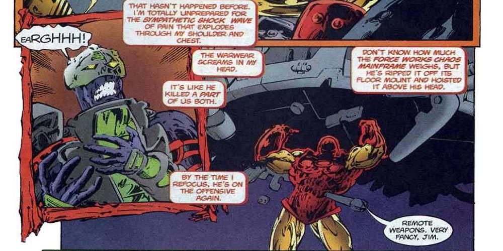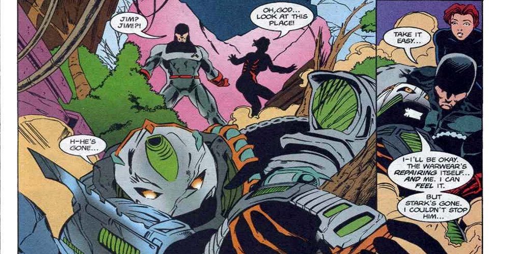 Sin embargo, lo que la mayoría de los fans no piensan es en la ropa de guerra del Eidolon. Introducido en War Machine #18 por Dan Abnett y Fred Haynes, el Eidolon Warwear fue una armadura alienígena que Rhodey adquirió y utilizó durante un par de años. El traje era un gran misterio para Rhodey, pero lo dominaba en los temas restantes de su historia en curso.