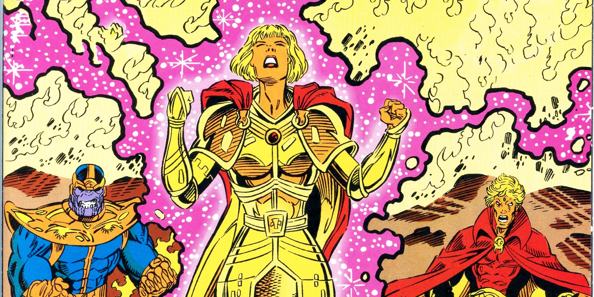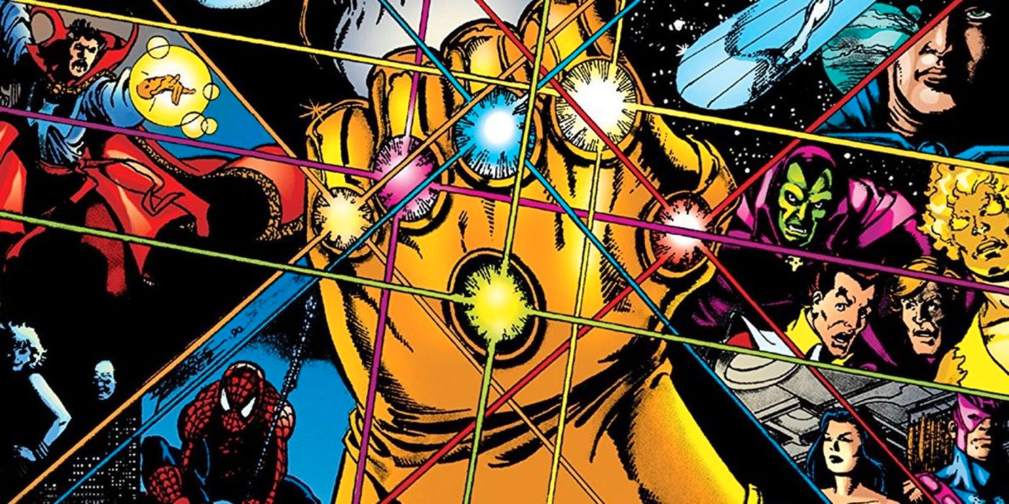 El primer gran evento de cruce de los 90 fue la ahora famosa serie de eventos de cruce del Infinity Gauntlet. Este es el libro en el que se basaron las películas, en el que Thanos consiguió su guante Infinito y borró gran parte de la existencia para intentar ganarse el amor de la Muerte.