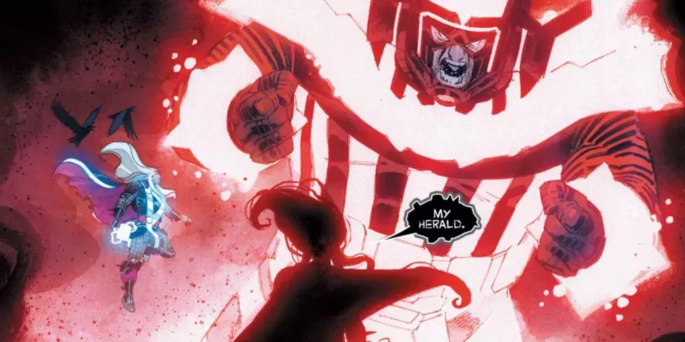 El Devorador no es en absoluto un devorador, sino un heraldo, el portador del Invierno Negro. Este giro hace que Galactus adquiera un cariz aún más premonitorio, ilustrando la destrucción que representa el personaje y la injusticia inherente a la vida que acaba con la vida.