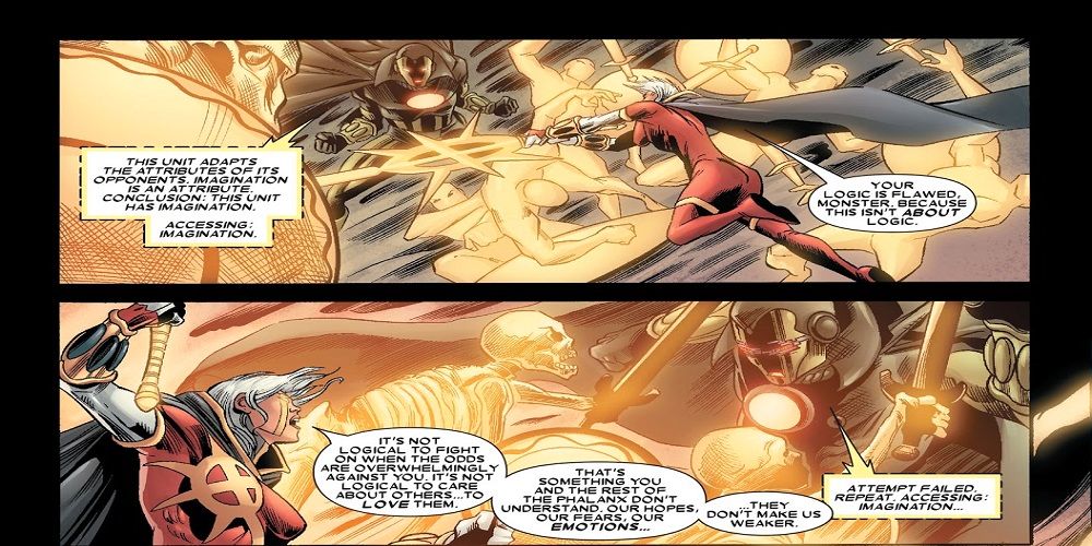 Durante ese tiempo, terminó luchando contra los Vengadores contra el Súper-Adaptoide. Él absorbió incluso el poder de sus bandas cuánticas y se adaptó a él, pero al final ella logró derrotarlo usando su imaginación superior para abrumarlo.