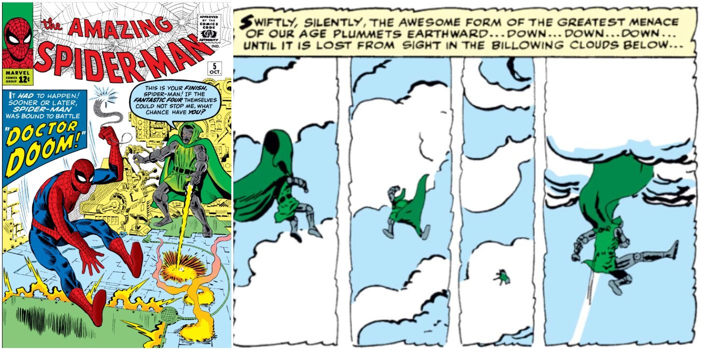 El primer encuentro de Doom con Spider-Man tuvo lugar en el número 5 de la serie homónima del trepamuros. La historia continúa a partir de Fantastic Four #17; este número revela que, al caer, se salvó de la muerte con los propulsores de la armadura.