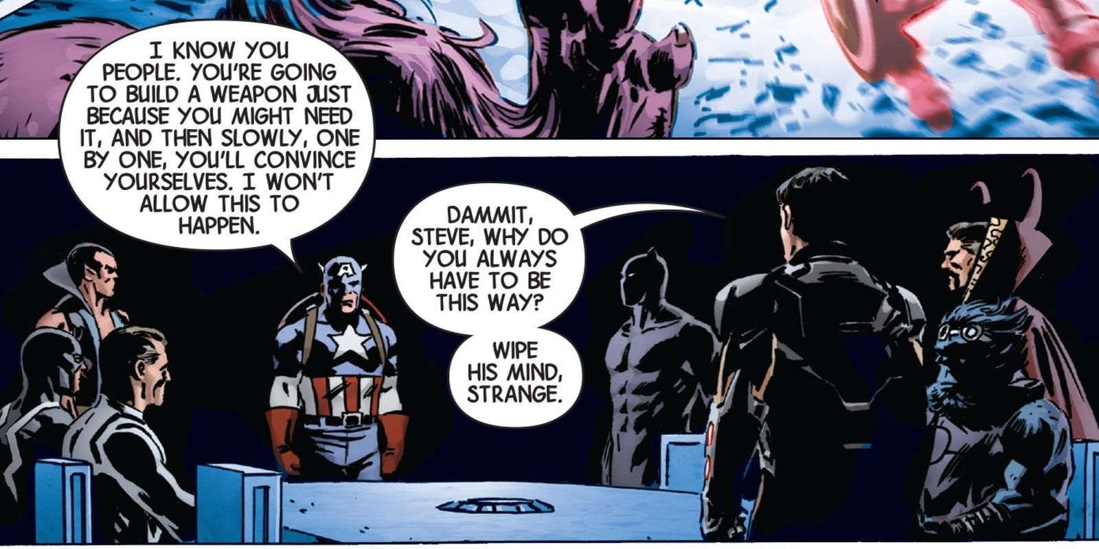 El Capitán América no podía creer que estuvieran considerando tal acción, y el Hombre de Hierro hizo que el Doctor Extraño le hiciese un barrido mental al Capitán y lo expulsase del grupo como represalia.