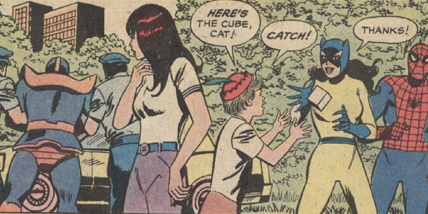 En la refriega, Thanos deja caer el Cubo y éste acaba en manos de un niño. Thanos entonces intimida a dicho niño por el Cubo, pero es interrumpido por Spider-Man y La Gata. Thanos es finalmente derrotado cuando resbala y deja caer el Cubo de nuevo en las manos del niño, que entonces lo utiliza para atar al Titán para las autoridades antes de entregar el Cubo a los superhéroes.