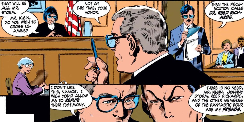En 1991, John Byrne finalmente hizo que Namor fuera juzgado por sus varios ataques contra "el mundo de la superficie" a lo largo de las décadas. Los miembros de los Cuatro Fantásticos fueron llamados como testigos de carácter pero vieron a un astuto fiscal sacar de ese testimonio pruebas que apoyaban la culpabilidad de Namor.
