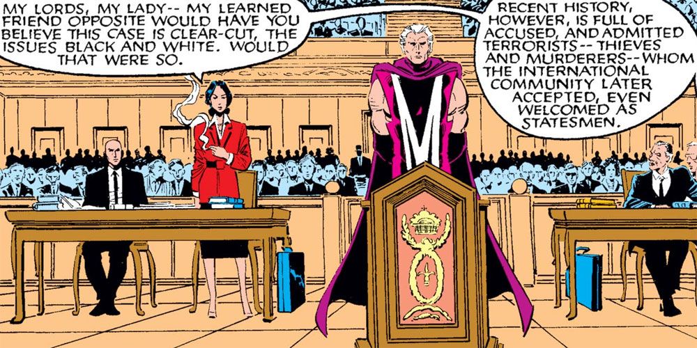 Las tensiones aumentaron cuando Magneto fue juzgado por sus acciones más recientes, entre ellas, el hundimiento de un submarino soviético y la muerte de todos los que iban a bordo. Magneto profesó que había cambiado sus costumbres y que estaba trabajando para encontrar medios pacíficos para preservar la humanidad mutante frente a los prejuicios. Cuando Fenris atacó el tribunal, Magneto mostró su voluntad de dar su vida por los inocentes que estaban en peligro. El Tribunal Mundial levantó la sesión sin juzgar a Magneto, pero varios jueces quedaron impresionados por su humanidad.