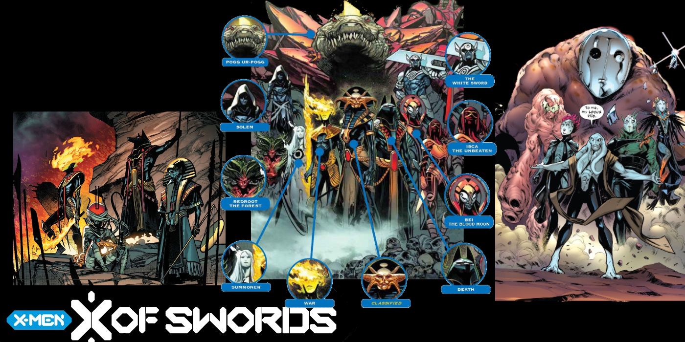 Los portadores de espadas de Arakko, como Pogg Ur-Pogg, Redroot the Forest, Bei the Blood Moon, y Solem, aparecieron por primera vez en los libros de eventos como X OF SWORDS: Stasis#1 y los títulos de las series en curso como Wolverine. Otras nuevas amenazas como Locus Vile en las páginas de Hellions. El evento también reveló los Cuatro Jinetes del Apocalipsis originales que se remontan al antiguo Egipto.