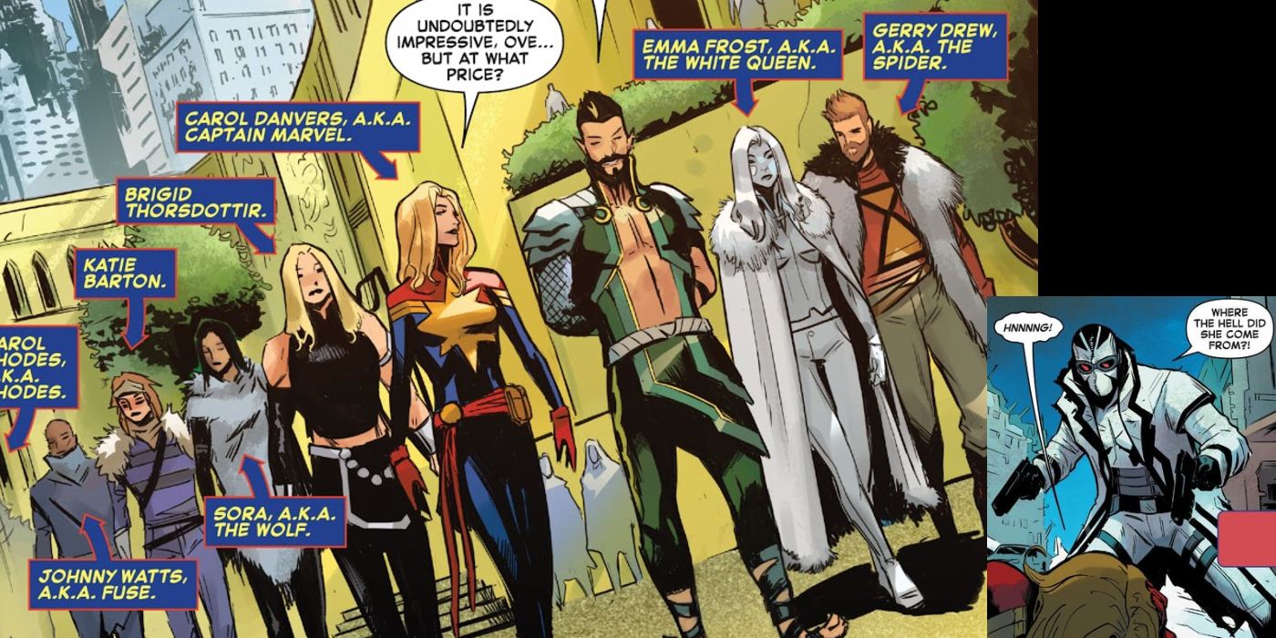 Una vez que supera el shock inicial de verse desplazada en el tiempo, a Carol le rompe el corazón el hecho de que muchos de sus amigos y aliados se hayan ido. Mientras lidia con esta conmoción, se reúne con versiones más antiguas de amigos como la Mujer Araña y su hijo ya adulto, Gerry Drew. También conoce a los futuros héroes como Sora, la hija de Forge y Kwannon (antes Psylocke); Fantomex5, el hijo de Namor, Ove; y Brigid Thorsdottir, la hija de Thor.