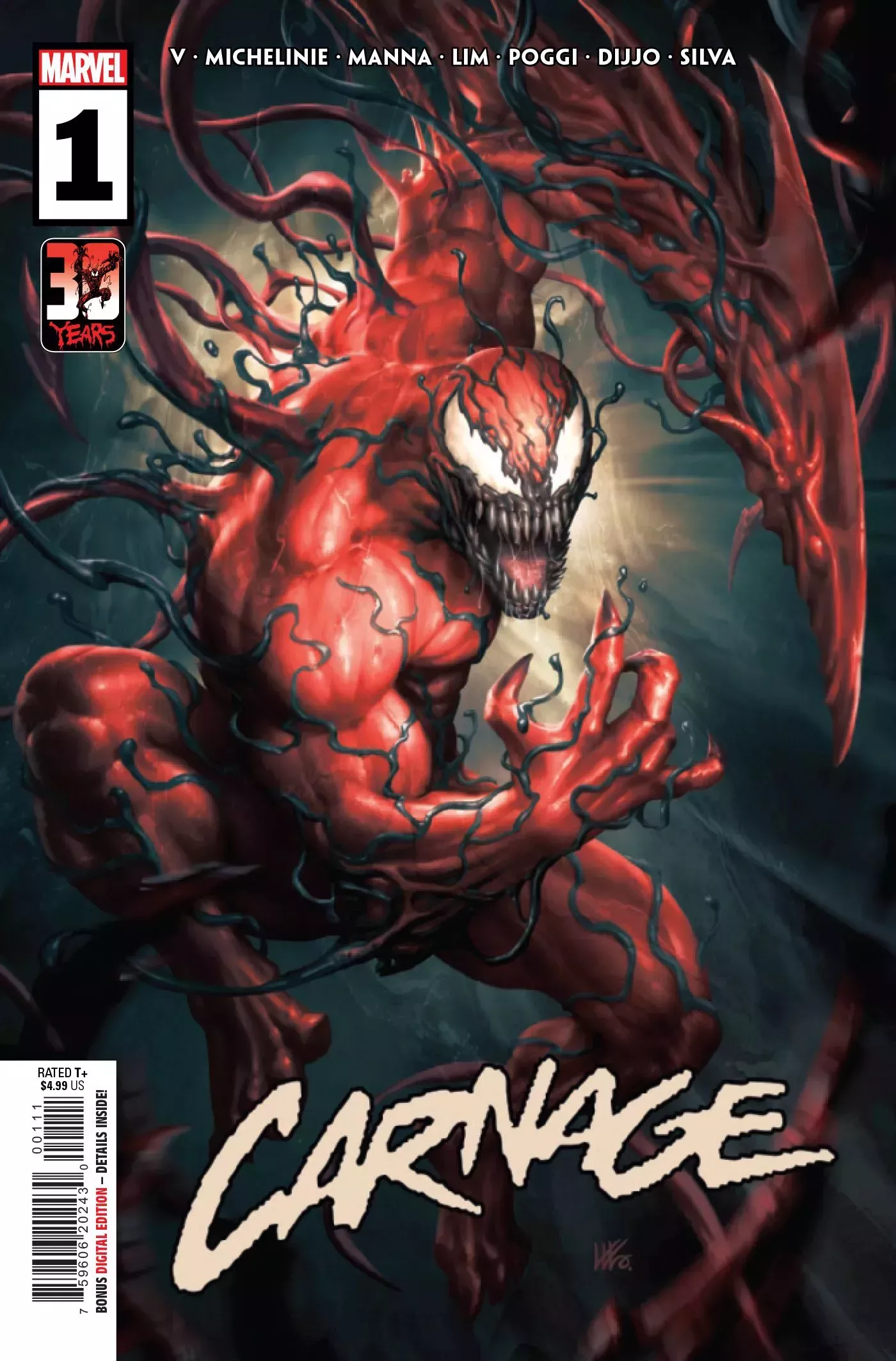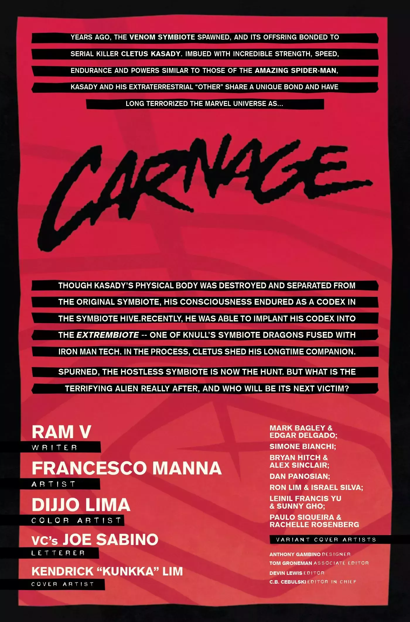 Carnage #1 está escrito por Ram V. con arte de Manna, colores de Dijjo Lima, letras de Joe Sabino de VC y arte de la portada principal de Kendrick "Kunkka" Lim. Las portadas variantes del número han sido realizadas por Mark Bagley, Edgar Delgado, Simone Bianchi, Bryan Hitch, Alex Sinclair, Dan Panosian, Ron Lim, Israel Silva, Leinil Francis Yu, Sunny Gho, Paulo Siqueira y Rachelle Rosenberg. El número sale a la venta el 16 de marzo en Marvel Comics.
