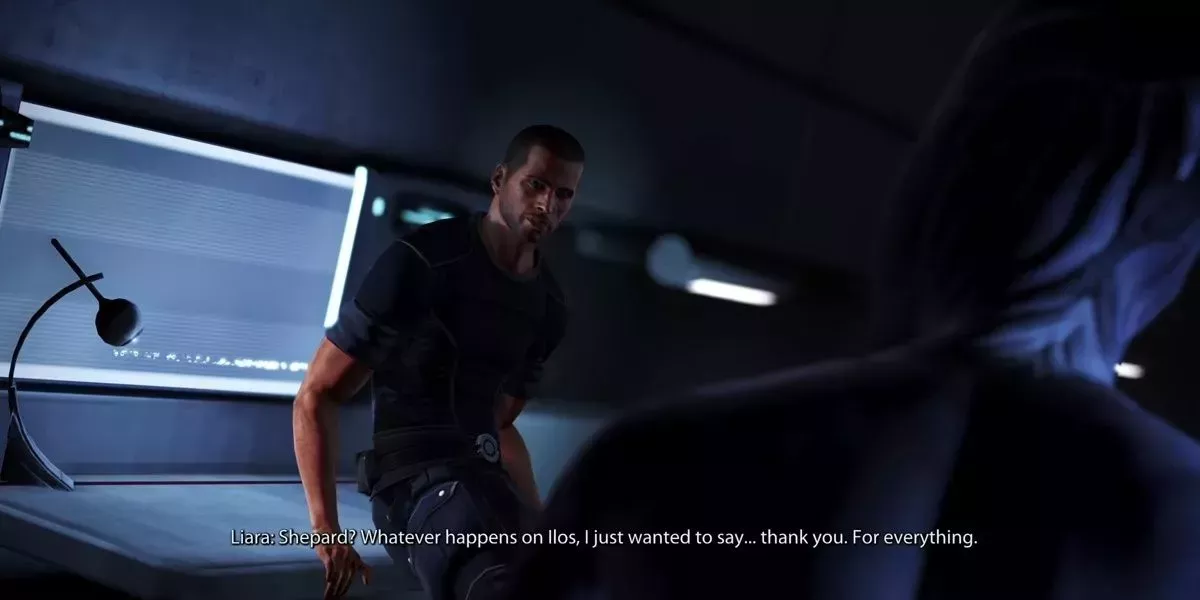Justo antes de la misión a Ilos, la comandante Shepard podría recibir una visita amorosa en sus aposentos privados a bordo de la Normandía, y podría ser Liara. De ser así, Liara tendrá su primera experiencia de intimar de verdad con alguien, lo que significa que está nerviosa pero emocionada.
