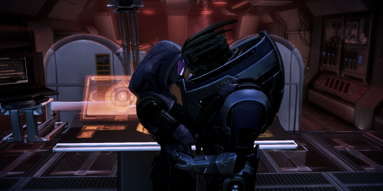 Ver a la quariana y al turiano besarse y escuchar lo que dicen deja bastante claro que su relación es más bien casual. Toda la situación muestra un lado divertido y excitante tanto de Tali como de Garrus.