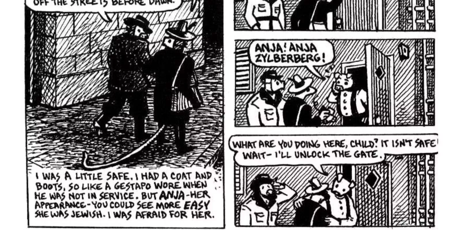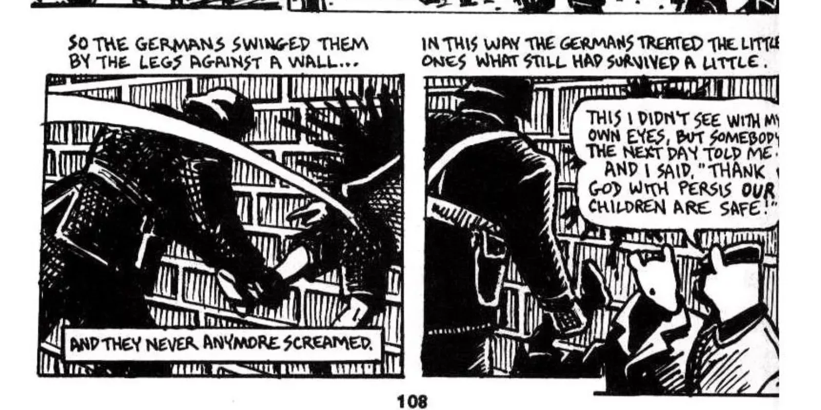 El simple hecho de leer sobre el genocidio ya es suficientemente perturbador. Sin embargo, verlo representado, de forma brutal y sin censura, es una experiencia sensorial totalmente diferente. Los personajes antropomórficos de Maus pueden dar la impresión inicial de ser un cuento infantil diluido, una píldora fácil de tragar para que los lectores más jóvenes aprendan sobre el Holocausto. Pero entonces se presentan imágenes como la de un niño al que se le abre la cabeza contra una pared de ladrillos en una salpicadura de sangre y vísceras. No se trata de un shock por el shock; es historia. No se suaviza el acto para ayudar al lector a digerir el contenido de la novela gráfica. La violencia se muestra en su totalidad, tal y como es necesario para el tema que se trata.
