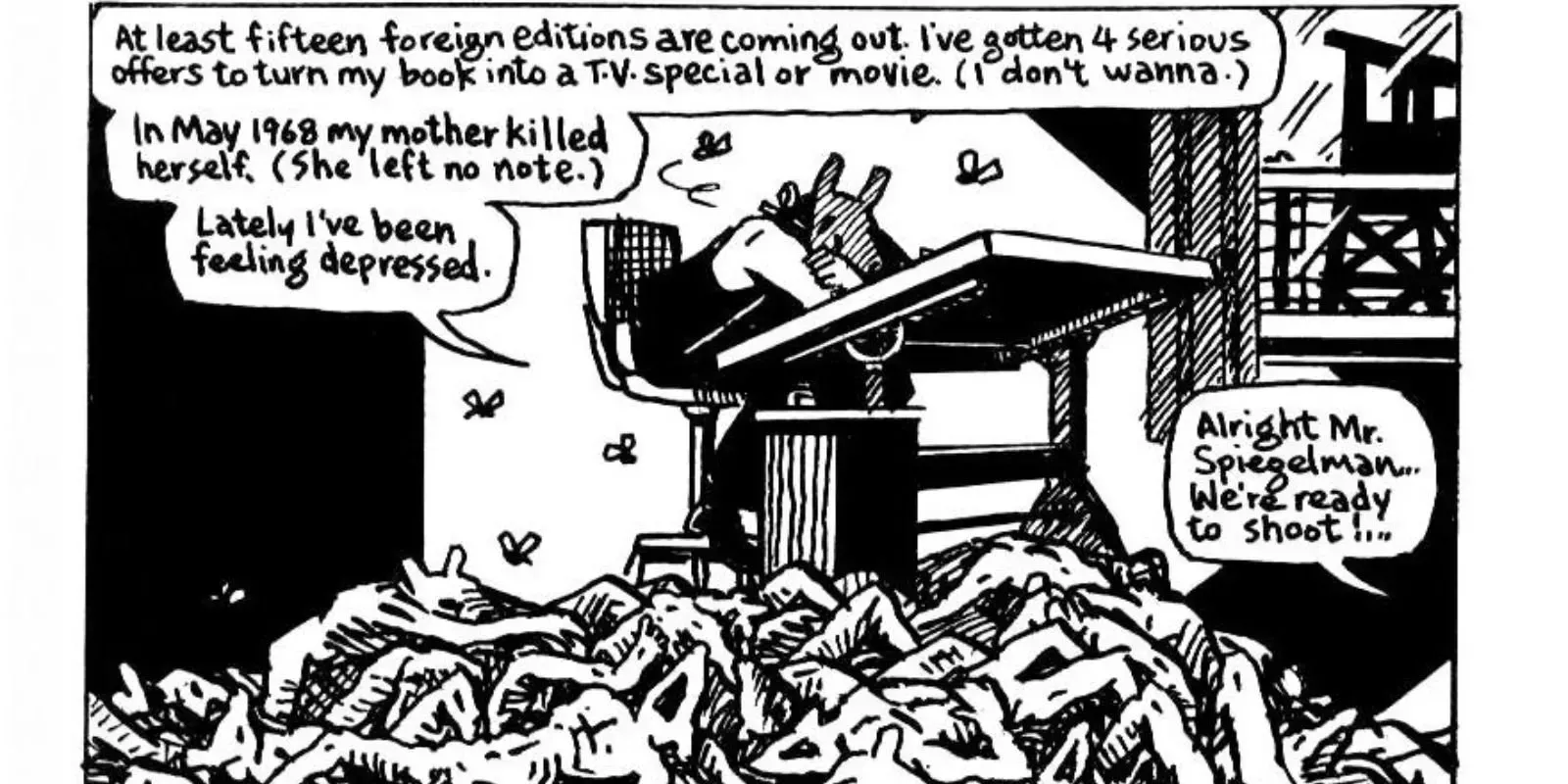 Hay un breve segmento en el que Art Spiegelman se aparta de la narración central de Maus y se dirige al lector en relación con el éxito de Maus como novela gráfica. La imagen que acompaña al libro muestra a Art sentado encima de una pila de cadáveres en descomposición, con las moscas llenando el aire alrededor de su cabeza. Como pieza de la literatura posmodernista, Maus muestra elementos definitivos del movimiento, como ser metaficción (como historia sobre un hombre que recopila información para escribir una historia), autorreflexividad (como se realiza en el segmento respectivo) e intertextualidad (ya que Maus es un texto basado en otro texto obtenido a través de la entrevista de Art con su padre). Maus también lleva el sello de los desafíos posmodernistas a la autoridad que estaban surgiendo como temas de finales de los años sesenta. En particular, tematiza la política, la historia y cómo se entrelazan.