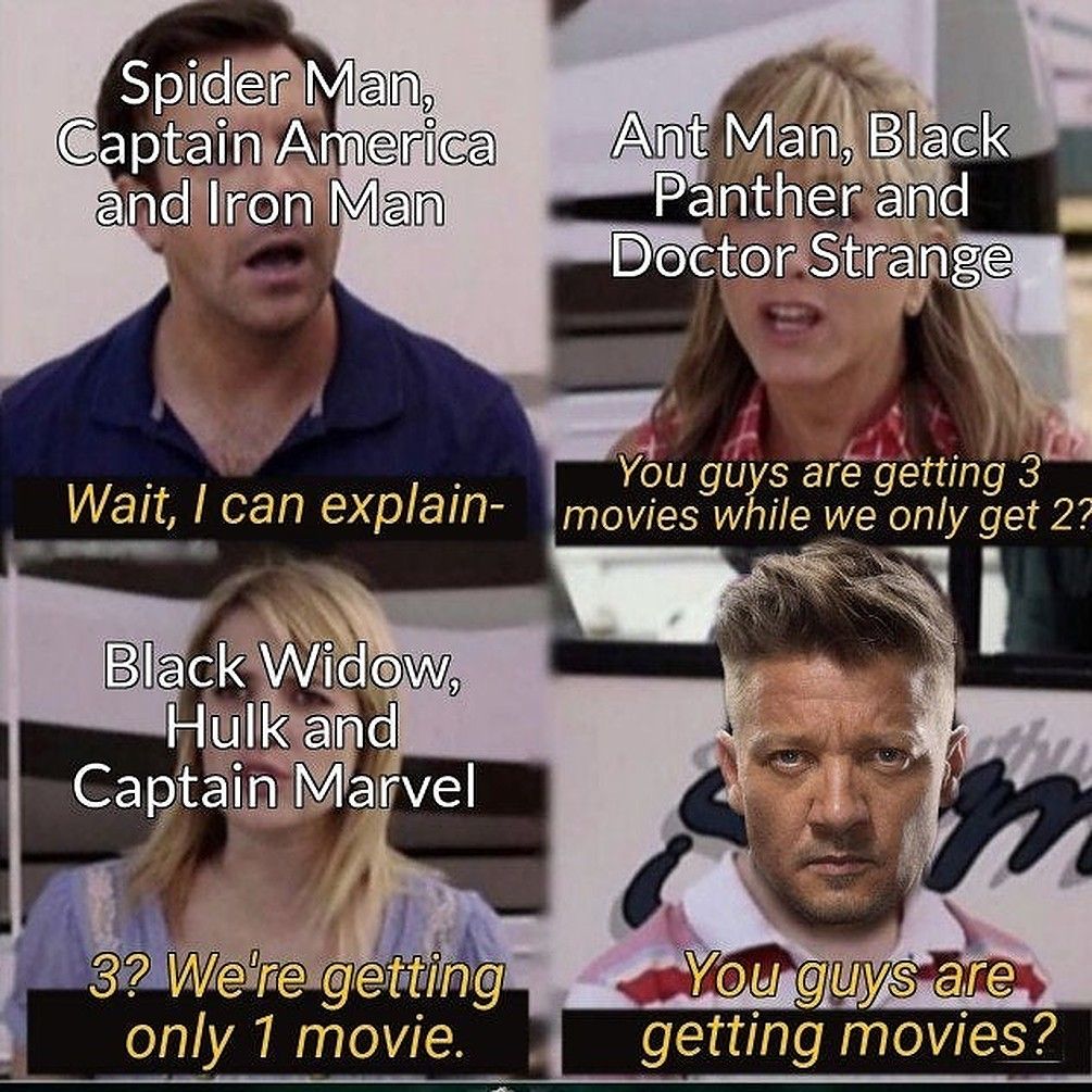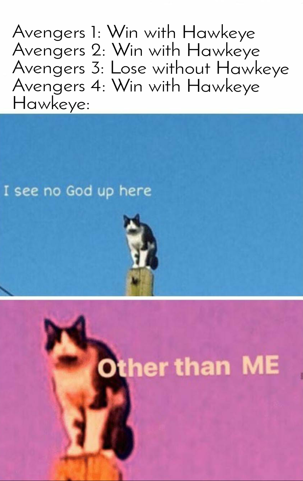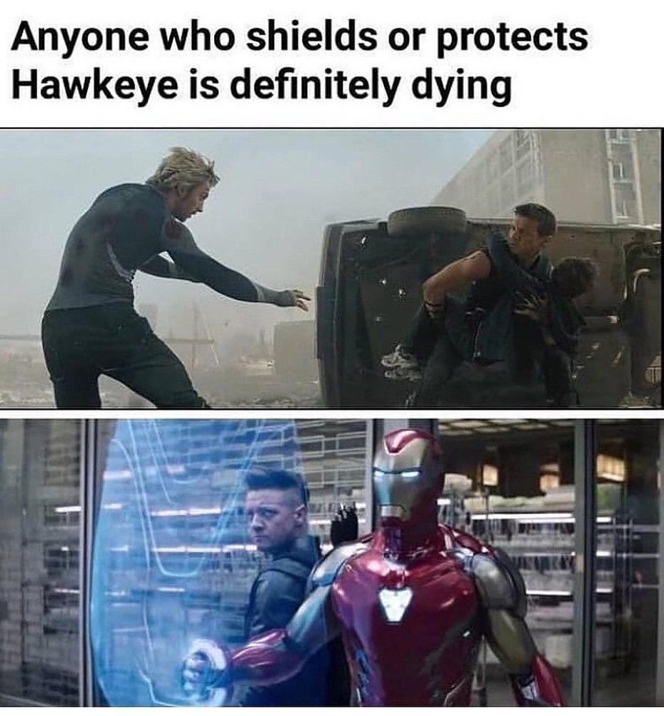 Muchos se han preguntado cómo se las arregló Ojo de Halcón para sobrevivir a todas las películas de Los Vengadores cuando es un tipo con un arco y una flecha, mientras que otros personajes mucho más poderosos que él han perecido. Este meme debería ser una explicación bastante adecuada del por qué.